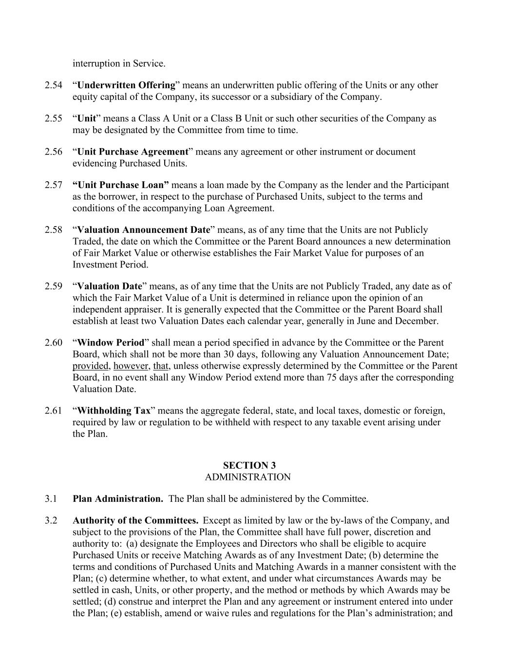 interruption in Service. 2.54 “Underwritten Offering” means an underwritten public offering of the Units or any other equity capital of the Company, its successor or a subsidiary of the Company. 2.55 “Unit” means a Class A Unit or a Class B Unit or such other securities of the Company as may be designated by the Committee from time to time. 2.56 “Unit Purchase Agreement” means any agreement or other instrument or document evidencing Purchased Units. 2.57 “Unit Purchase Loan” means a loan made by the Company as the lender and the Participant as the borrower, in respect to the purchase of Purchased Units, subject to the terms and conditions of the accompanying Loan Agreement. 2.58 “Valuation Announcement Date” means, as of any time that the Units are not Publicly Traded, the date on which the Committee or the Parent Board announces a new determination of Fair Market Value or otherwise establishes the Fair Market Value for purposes of an Investment Period. 2.59 “Valuation Date” means, as of any time that the Units are not Publicly Traded, any date as of which the Fair Market Value of a Unit is determined in reliance upon the opinion of an independent appraiser. It is generally expected that the Committee or the Parent Board shall establish at least two Valuation Dates each calendar year, generally in June and December. 2.60 “Window Period” shall mean a period specified in advance by the Committee or the Parent Board, which shall not be more than 30 days, following any Valuation Announcement Date; provided, however, that, unless otherwise expressly determined by the Committee or the Parent Board, in no event shall any Window Period extend more than 75 days after the corresponding Valuation Date. 2.61 “Withholding Tax” means the aggregate federal, state, and local taxes, domestic or foreign, required by law or regulation to be withheld with respect to any taxable event arising under the Plan. SECTION 3 ADMINISTRATION 3.1 Plan Administration. The Plan shall be administered by the Committee. 3.2 Authority of the Committees. Except as limited by law or the by-laws of the Company, and subject to the provisions of the Plan, the Committee shall have full power, discretion and authority to: (a) designate the Employees and Directors who shall be eligible to acquire Purchased Units or receive Matching Awards as of any Investment Date; (b) determine the terms and conditions of Purchased Units and Matching Awards in a manner consistent with the Plan; (c) determine whether, to what extent, and under what circumstances Awards may be settled in cash, Units, or other property, and the method or methods by which Awards may be settled; (d) construe and interpret the Plan and any agreement or instrument entered into under the Plan; (e) establish, amend or waive rules and regulations for the Plan’s administration; and