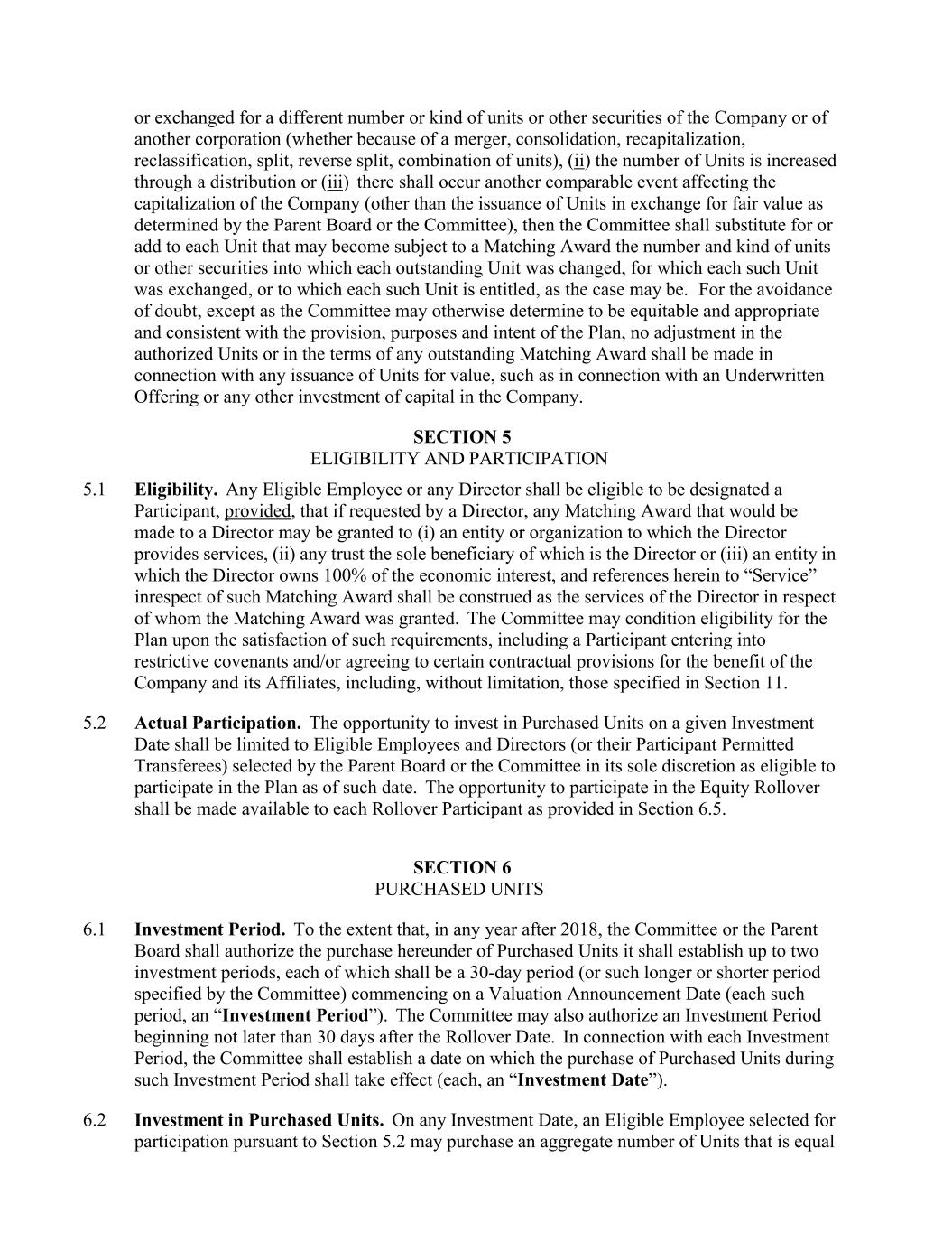 or exchanged for a different number or kind of units or other securities of the Company or of another corporation (whether because of a merger, consolidation, recapitalization, reclassification, split, reverse split, combination of units), (ii) the number of Units is increased through a distribution or (iii) there shall occur another comparable event affecting the capitalization of the Company (other than the issuance of Units in exchange for fair value as determined by the Parent Board or the Committee), then the Committee shall substitute for or add to each Unit that may become subject to a Matching Award the number and kind of units or other securities into which each outstanding Unit was changed, for which each such Unit was exchanged, or to which each such Unit is entitled, as the case may be. For the avoidance of doubt, except as the Committee may otherwise determine to be equitable and appropriate and consistent with the provision, purposes and intent of the Plan, no adjustment in the authorized Units or in the terms of any outstanding Matching Award shall be made in connection with any issuance of Units for value, such as in connection with an Underwritten Offering or any other investment of capital in the Company. SECTION 5 ELIGIBILITY AND PARTICIPATION 5.1 Eligibility. Any Eligible Employee or any Director shall be eligible to be designated a Participant, provided, that if requested by a Director, any Matching Award that would be made to a Director may be granted to (i) an entity or organization to which the Director provides services, (ii) any trust the sole beneficiary of which is the Director or (iii) an entity in which the Director owns 100% of the economic interest, and references herein to “Service” inrespect of such Matching Award shall be construed as the services of the Director in respect of whom the Matching Award was granted. The Committee may condition eligibility for the Plan upon the satisfaction of such requirements, including a Participant entering into restrictive covenants and/or agreeing to certain contractual provisions for the benefit of the Company and its Affiliates, including, without limitation, those specified in Section 11. 5.2 Actual Participation. The opportunity to invest in Purchased Units on a given Investment Date shall be limited to Eligible Employees and Directors (or their Participant Permitted Transferees) selected by the Parent Board or the Committee in its sole discretion as eligible to participate in the Plan as of such date. The opportunity to participate in the Equity Rollover shall be made available to each Rollover Participant as provided in Section 6.5. SECTION 6 PURCHASED UNITS 6.1 Investment Period. To the extent that, in any year after 2018, the Committee or the Parent Board shall authorize the purchase hereunder of Purchased Units it shall establish up to two investment periods, each of which shall be a 30-day period (or such longer or shorter period specified by the Committee) commencing on a Valuation Announcement Date (each such period, an “Investment Period”). The Committee may also authorize an Investment Period beginning not later than 30 days after the Rollover Date. In connection with each Investment Period, the Committee shall establish a date on which the purchase of Purchased Units during such Investment Period shall take effect (each, an “Investment Date”). 6.2 Investment in Purchased Units. On any Investment Date, an Eligible Employee selected for participation pursuant to Section 5.2 may purchase an aggregate number of Units that is equal