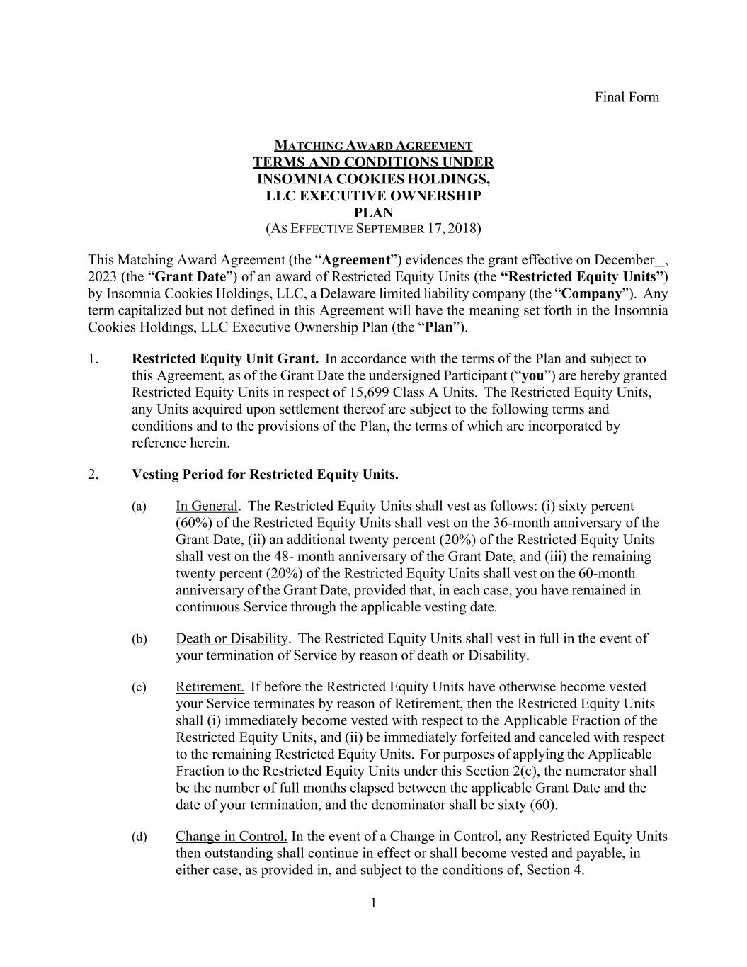 1 Final Form MATCHING AWARD AGREEMENT TERMS AND CONDITIONS UNDER INSOMNIA COOKIES HOLDINGS, LLC EXECUTIVE OWNERSHIP PLAN (AS EFFECTIVE SEPTEMBER 17, 2018) This Matching Award Agreement (the “Agreement”) evidences the grant effective on December , 2023 (the “Grant Date”) of an award of Restricted Equity Units (the “Restricted Equity Units”) by Insomnia Cookies Holdings, LLC, a Delaware limited liability company (the “Company”). Any term capitalized but not defined in this Agreement will have the meaning set forth in the Insomnia Cookies Holdings, LLC Executive Ownership Plan (the “Plan”). 1. Restricted Equity Unit Grant. In accordance with the terms of the Plan and subject to this Agreement, as of the Grant Date the undersigned Participant (“you”) are hereby granted Restricted Equity Units in respect of 15,699 Class A Units. The Restricted Equity Units, any Units acquired upon settlement thereof are subject to the following terms and conditions and to the provisions of the Plan, the terms of which are incorporated by reference herein. 2. Vesting Period for Restricted Equity Units. (a) In General. The Restricted Equity Units shall vest as follows: (i) sixty percent (60%) of the Restricted Equity Units shall vest on the 36-month anniversary of the Grant Date, (ii) an additional twenty percent (20%) of the Restricted Equity Units shall vest on the 48- month anniversary of the Grant Date, and (iii) the remaining twenty percent (20%) of the Restricted Equity Units shall vest on the 60-month anniversary of the Grant Date, provided that, in each case, you have remained in continuous Service through the applicable vesting date. (b) Death or Disability. The Restricted Equity Units shall vest in full in the event of your termination of Service by reason of death or Disability. (c) Retirement. If before the Restricted Equity Units have otherwise become vested your Service terminates by reason of Retirement, then the Restricted Equity Units shall (i) immediately become vested with respect to the Applicable Fraction of the Restricted Equity Units, and (ii) be immediately forfeited and canceled with respect to the remaining Restricted Equity Units. For purposes of applying the Applicable Fraction to the Restricted Equity Units under this Section 2(c), the numerator shall be the number of full months elapsed between the applicable Grant Date and the date of your termination, and the denominator shall be sixty (60). (d) Change in Control. In the event of a Change in Control, any Restricted Equity Units then outstanding shall continue in effect or shall become vested and payable, in either case, as provided in, and subject to the conditions of, Section 4.