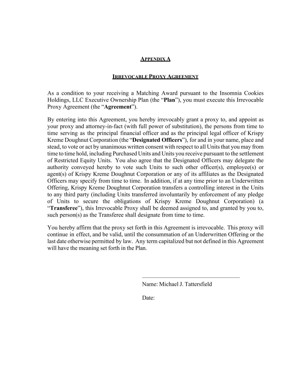 APPENDIX A IRREVOCABLE PROXY AGREEMENT As a condition to your receiving a Matching Award pursuant to the Insomnia Cookies Holdings, LLC Executive Ownership Plan (the “Plan”), you must execute this Irrevocable Proxy Agreement (the “Agreement”). By entering into this Agreement, you hereby irrevocably grant a proxy to, and appoint as your proxy and attorney-in-fact (with full power of substitution), the persons from time to time serving as the principal financial officer and as the principal legal officer of Krispy Kreme Doughnut Corporation (the “Designated Officers”), for and in your name, place and stead, to vote or act by unanimous written consent with respect to all Units that you may from time to time hold, including Purchased Units and Units you receive pursuant to the settlement of Restricted Equity Units. You also agree that the Designated Officers may delegate the authority conveyed hereby to vote such Units to such other officer(s), employee(s) or agent(s) of Krispy Kreme Doughnut Corporation or any of its affiliates as the Designated Officers may specify from time to time. In addition, if at any time prior to an Underwritten Offering, Krispy Kreme Doughnut Corporation transfers a controlling interest in the Units to any third party (including Units transferred involuntarily by enforcement of any pledge of Units to secure the obligations of Krispy Kreme Doughnut Corporation) (a “Transferee”), this Irrevocable Proxy shall be deemed assigned to, and granted by you to, such person(s) as the Transferee shall designate from time to time. You hereby affirm that the proxy set forth in this Agreement is irrevocable. This proxy will continue in effect, and be valid, until the consummation of an Underwritten Offering or the last date otherwise permitted by law. Any term capitalized but not defined in this Agreement will have the meaning set forth in the Plan. Name: Michael J. Tattersfield Date: