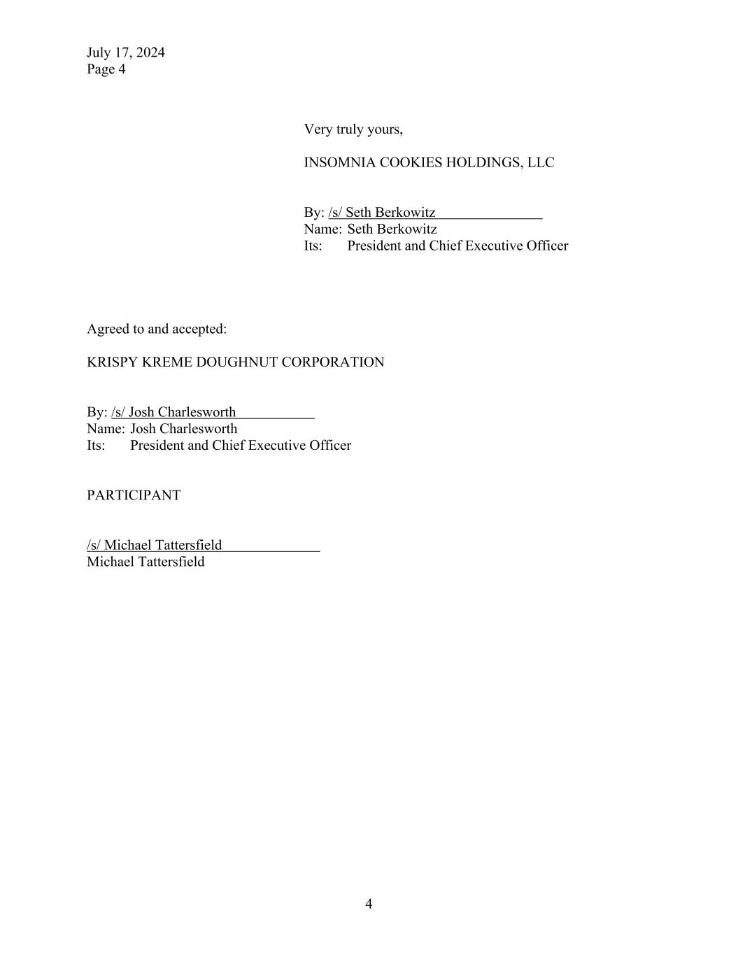 July 17, 2024 Page 4 4 Very truly yours, INSOMNIA COOKIES HOLDINGS, LLC By: /s/ Seth Berkowitz Name: Seth Berkowitz Its: President and Chief Executive Officer Agreed to and accepted: KRISPY KREME DOUGHNUT CORPORATION By: /s/ Josh Charlesworth Name: Josh Charlesworth Its: President and Chief Executive Officer PARTICIPANT /s/ Michael Tattersfield Michael Tattersfield