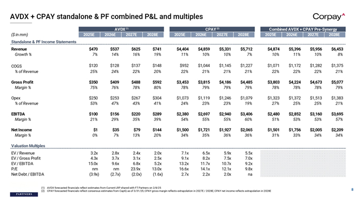 CPAY accretion / dilution analysis (assuming no synergies) CPAY Acquisition of AVDX Illustrative Accretion / Dilution at $12.00 per Share Purchase Price ($ in mm; shares in mm) Case 1 - 100% Cash 2026E 2027E Commentary ▪ Acquisition date: 12/31/25 Case 2 - 50% Cash / 50% Equity 2026E 2027E ▪ Total acquisition consideration: $2.4bn (assumes $100mm in combined buyer / seller transaction expenses) $2,011 380 $2,391 $2,011 380 $2,391 $815 380 1,195 $2,391 $815 380 1,195 $2,391 ▪ Purchase price per share: $12.00 CPAY Net Income CPAY Fully Diluted Shares CPAY EPS $1,721 72 $23.96 $1,927 72 $26.83 $1,721 72 $23.96 $1,927 72 $26.83 ▪ No synergies assumed M&A Adjustm ents AvidXchange Net Income (2) Standalone Interest Expense Elimination Incremental Acquisition Net Interest Expense Acquired Intangible Amortization Tax Shield / (Expense) from M&A Adjustments Total M&A Adjustm ents $35 1 (129) (56) 48 ($101) $79 1 (129) (56) 48 ($57) $35 1 (52) (56) 28 ($44) $79 1 (52) (56) 28 ($1) CPAY Share Price New ly Issued Shares Pro Form a Shares $348.72 72 $348.72 72 $348.72 3 75 $348.72 3 75 AVDX EV ($mm) $1,841 $2,066 $2,291 $2,517 $2,744 Purchase Price $10.00 $11.00 $12.00 $13.00 $14.00 Pro Forma Net Income Pro Form a EPS $1,620 $22.56 $1,870 $26.03 $1,677 $22.28 $1,926 $25.60 % Cash Pro Form a EPS Acquisition Debt Financing AVDX Balance Sheet Net Cash Stock Issuance Total Acquisition Sources 0% 25% 50% 75% 100% (6%) (6%) (5%) (5%) (4%) (7%) (7%) (6%) (5%) (5%) (8%) (8%) (7%) (6%) (6%) (9%) (9%) (8%) (7%) (7%) (10%) (10%) (9%) (8%) (8%) Accretion / Dilution per Share Accretion / Dilution % ($1.40) (6%) ($0.80) (3%) ($1.68) (7%) ($1.23) (5%) Im plied Pre-Tax Synergies to Breakeven % of AvidXchange OpEx $101 40% $57 21% $126 50% $93 35% $8,336 2.9x $8,337 2.6x $7,141 2.6x $7,142 2.4x (1) ▪ Amortizable intangible asset step-up: 30% ▪ Tax rate: 26% CPAY % A/D Sensitivity by Consideration & Purchase Price 2026E Accretion / Dilution % Pro Form a Accretion / Dilution and Net Debt (1) CPAY forecasted financials reflect consensus estimates from CapIQ as of 3/31/25 (2) AVDX forecasted financials reflect estimates from Current LRP shared with FT Partners on 2/8/25 % Cash AVDX + CPAY Com bined Net Debt AVDX + CPAY Net Debt / EBITDA 2027E Accretion / Dilution % 0% 25% 50% 75% 100% (4%) (3%) (3%) (2%) (1%) (5%) (4%) (4%) (3%) (2%) (6%) (5%) (5%) (4%) (3%) (7%) (6%) (6%) (5%) (4%) (8%) (7%) (6%) (6%) (5%) 9