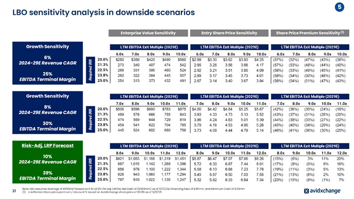 LBO sensitivity analysis in downside scenarios 5 21 Growth Sensitivity 6% 2024-29E Revenue CAGR 25% EBITDA Terminal Margin Growth Sensitivity 8% 2024-29E Revenue CAGR 30% EBITDA Terminal Margin Risk-Adj. LRP Forecast 10% 2024-29E Revenue CAGR 39% EBITDA Terminal Margin Enterprise Value Sensitivity Entry Share Price Sensitivity LTM EBITDA Exit Multiple (2029E) 8.0x 9.0x 10.0x 11.0x 12.0x 20.0% $921 $1,053 $1,186 $1,319 $1,451 21.3% 887 1,015 1,142 1,269 1,396 22.5% 856 978 1,100 1,222 1,344 23.8% 826 943 1,060 1,177 1,294 25.0% 797 910 1,022 1,135 1,247 Required IRR LTM EBITDA Exit Multiple (2029E) 8.0x 9.0x 10.0x 11.0x 12.0x $5.87 $6.47 $7.07 $7.66 $8.26 5.72 6.30 6.87 7.44 8.01 5.58 6.13 6.68 7.23 7.78 5.45 5.97 6.50 7.03 7.55 5.32 5.82 6.33 6.84 7.34 LTM EBITDA Exit Multiple (2029E) 6.0x 7.0x 8.0x 9.0x 10.0x $2.99 $3.30 $3.62 $3.93 $4.25 2.95 3.26 3.56 3.86 4.17 2.92 3.21 3.51 3.80 4.09 2.89 3.17 3.45 3.73 4.01 2.87 3.14 3.40 3.67 3.94 LTM EBITDA Exit Multiple (2029E) 6.0x 7.0x 8.0x 9.0x 10.0x 20.0% $280 $350 $420 $490 $560 21.3% 273 340 407 474 542 22.5% 266 331 395 460 524 23.8% 260 322 384 445 507 25.0% 254 313 373 432 491 Required IRR LTM EBITDA Exit Multiple (2029E) 7.0x 8.0x 9.0x 10.0x 11.0x 20.0% $506 $598 $690 $783 $875 21.3% 489 578 666 755 843 22.5% 474 559 644 729 814 23.8% 459 541 622 704 785 25.0% 445 524 602 680 758 Required IRR LTM EBITDA Exit Multiple (2029E) 7.0x 8.0x 9.0x 10.0x 11.0x $4.00 $4.42 $4.84 $5.25 $5.67 3.93 4.33 4.73 5.13 5.52 3.86 4.24 4.63 5.01 5.39 3.79 4.16 4.53 4.90 5.26 3.73 4.08 4.44 4.79 5.14 LTM EBITDA Exit Multiple (2029E) 8.0x 9.0x 10.0x 11.0x 12.0x (15%) (6%) 3% 11% 20% (17%) (9%) (0%) 8% 16% (19%) (11%) (3%) 5% 13% (21%) (13%) (6%) 2% 10% (23%) (15%) (8%) (1%) 7% Share Price Premium Sensitivity (1) LTM EBITDA Exit Multiple (2029E) 7.0x 8.0x 9.0x 10.0x 11.0x (42%) (36%) (30%) (24%) (18%) (43%) (37%) (31%) (26%) (20%) (44%) (38%) (33%) (27%) (22%) (45%) (40%) (34%) (29%) (24%) (46%) (41%) (36%) (30%) (25%) LTM EBITDA Exit Multiple (2029E) 6.0x 7.0x 8.0x 9.0x 10.0x (57%) (52%) (47%) (43%) (38%) (57%) (53%) (48%) (44%) (40%) (58%) (53%) (49%) (45%) (41%) (58%) (54%) (50%) (46%) (42%) (58%) (54%) (51%) (47%) (43%) Note: LBO assumes leverage of $550mm based on 6.5x Q1’25 LTM Adj. EBITDA, Net Debt of ($380mm) as of 12/31/24, Financing Fees of $35mm, and Minimum Cash of $30mm (1) Unaffected share price premium / discount % based on AvidXchange share price of $6.89 as of 3/12/25