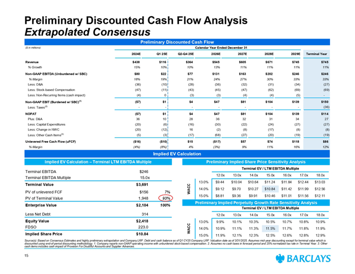 Preliminary Discounted Cash Flow Analysis Company LRP Preliminary Discounted Cash Flow Calendar Year Ended December 31 ($ in millions) Revenue % Growth Non-GAAP EBITDA (Unburdened w/ SBC) 2024E Q1 25E Q2-Q4 25E 2026E 2027E 2028E 2029E Terminal Year $439 $116 $370 $567 $668 $788 $922 $922 15% 10% 11% 16% 18% 18% 17% 17% $80 $21 $83 $161 $229 $303 $387 $387 % Margin 18% 18% 22% 28% 34% 39% 42% 42% Less: D&A (36) (10) (28) (36) (32) (31) (34) (27) Less: Stock-based Compensation (47) (11) (43) (45) (47) (62) (69) (69) Less: Non-Recurring Items (cash impact) (4) 0 (3) (3) (4) (4) (5) - ($7) $1 $10 $76 $146 $206 $280 $291 - - - - - - - (70) $221 Non-GAAP EBIT (Burdened w/ SBC) Less: Taxes(2) NOPAT (1) ($7) $1 $10 $76 $146 $206 $280 Plus: D&A 36 10 28 36 32 31 34 27 Less: Capital Expenditures (20) (6) (16) (30) (22) (24) (27) (27) Less: Change in NWC (20) (12) 16 (2) (8) (17) (8) (8) (5) (3) (17) (68) (27) (20) (19) (19) ($16) ($10) $20 $13 $123 $176 $259 $194 (4%) (9%) 6% 2% 18% 22% 28% 21% Less: Other Cash Items (3) Unlevered Free Cash Flow (uFCF) % Margin Implied EV Calculation Implied EV Calculation – Terminal LTM EBITDA Multiple $387 Terminal EBITDA Multiple 15.0x Terminal Value Terminal EV / LTM EBITDA Multiple $5,807 PV of unlevered FCF $379 11% PV of Terminal Value 3,066 89% Enterprise Value $3,445 100% WACC Terminal EBITDA Preliminary Implied Share Price Sensitivity Analysis 1671.6% 12.0x 13.0x 14.0x 15.0x 16.0x 17.0x 18.0x 13.0% $14.56 $15.49 $16.42 $17.35 $18.29 $19.22 $20.15 14.0% $14.04 $14.93 $15.82 $16.72 $17.61 $18.50 $19.40 15.0% $13.54 $14.40 $15.25 $16.11 $16.97 $17.82 $18.68 Preliminary Implied Perpetuity Growth Rate Sensitivity Analysis Terminal EV / LTM EBITDA Multiple 314 10.4% 12.0x 13.0x 14.0x 15.0x 16.0x 17.0x 18.0x Equity Value $3,759 13.0% 8.6% 8.9% 9.2% 9.5% 9.7% 9.9% 10.0% FDSO 224.9 14.0% 9.5% 9.9% 10.2% 10.4% 10.7% 10.9% 11.0% Implied Share Price $16.72 15.0% 10.5% 10.9% 11.2% 11.4% 11.6% 11.8% 12.0% WACC Less Net Debt Source(s): Based on Company LRP. Note: Debt and cash balance as of Q1 CY25 Company LRP. Valuation date as of 3/31/2025. Assumes mid-year discounting except for terminal value which is discounted using end-of-period discounting methodology. 1. Company reports non-GAAP operating income with unburdened stock based compensation. 2. Assumes no cash taxes in forecast period and 24% normalized tax rate in Terminal Year. 3. Other cash items includes cash impact of Provision For Doubtful Accounts and Supplier Advances. 10
