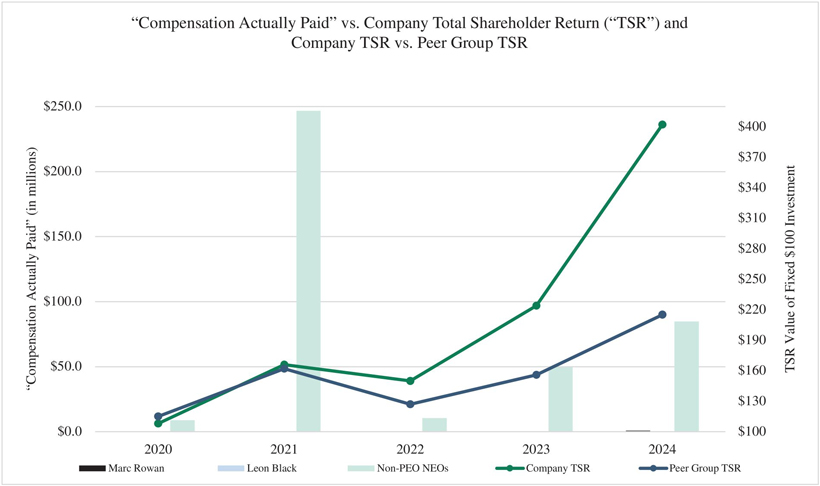 | • | decisions related to expenses, such as determining annual discretionary bonuses and equity-based compensation awards to its employees. With respect to compensation, management seeks to align the interests of certain professionals and selected other individuals with those of the investors in the funds and those of Apollo’s stockholders by providing such individuals a profit sharing interest in the performance fees earned in relation to the funds. To achieve that objective, a certain amount of compensation is based on Apollo’s performance and growth for the year; and |