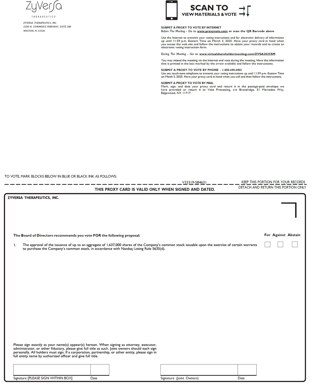 Please monitor the Investor Relations section of our website at http://investors.zyversa.com for updated information regarding the Special Meeting. If you are planning to attend our virtual Special Meeting, please check the website one week prior to the Special Meeting date. As always, we encourage you to submit a proxy to vote your shares prior to the Special Meeting.