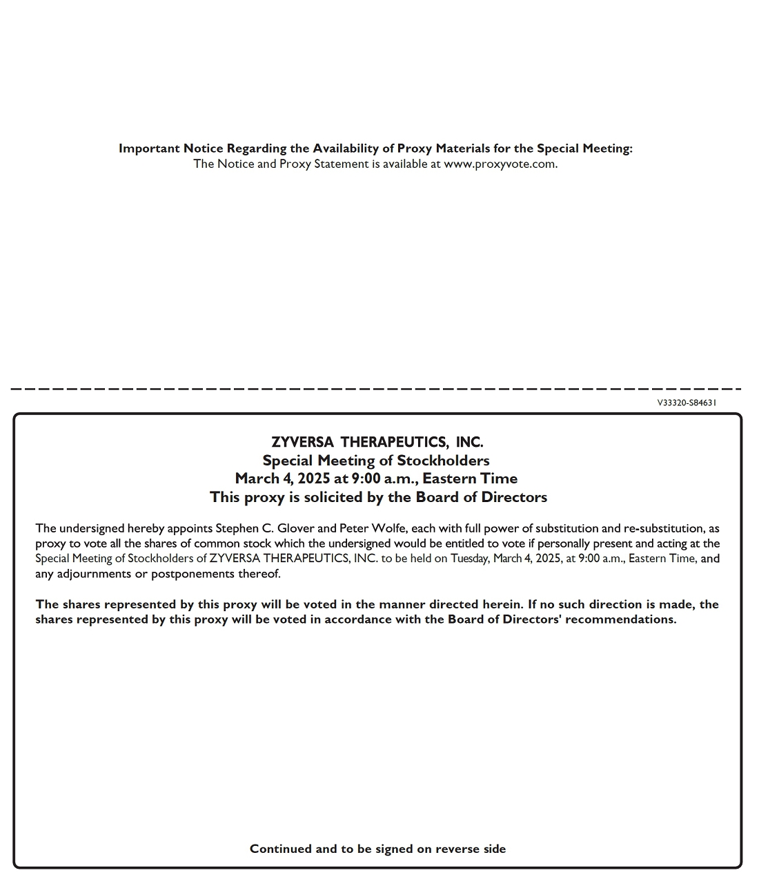 You are cordially invited to attend the 2025 Special Meeting of Stockholders (the “Special Meeting”) of ZyVersa Therapeutics, Inc., a Delaware corporation. The meeting will be held in a virtual-only format via live webcast on Tuesday, March 4, 2025, at 9:00 a.m. Eastern Time. To access the webcast, please visit http://www.virtualshareholdermeeting.com/ZVSA2025SM and enter the 16-digit control number included in your Notice of Internet Availability of Proxy Materials, on your proxy card, or in the instructions that accompanied your proxy materials. The purposes of the Special Meeting are as follows: