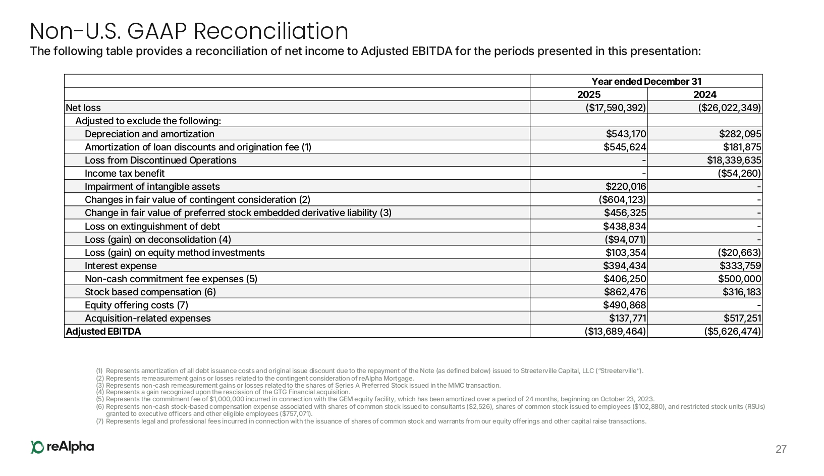 Non - U.S. GAAP Reconciliation The following table provides a reconciliation of net income to Adjusted EBITDA for the periods presented in this presentation: 27 (1) Represents amortization of all debt issuance costs and original issue discount due to the repayment of the Note (as defined below) issued to Streeterville Capital, LLC (“Streeterville”). (2) Represents remeasurement gains or losses related to the contingent consideration of reAlpha Mortgage. (3) Represents non - cash remeasurement gains or losses related to the shares of Series A Preferred Stock issued in the MMC transaction. (4) Represents a gain recognized upon the rescission of the GTG Financial acquisition. (5) Represents the commitment fee of $1,000,000 incurred in connection with the GEM equity facility, which has been amortized over a period of 24 months, beginning on October 23, 2023. (6) Represents non - cash stock - based compensation expense associated with shares of common stock issued to consultants ($2,526), shares of common stock issued to employees ($102,880), and restricted stock units (RSUs) granted to executive officers and other eligible employees ($757,071). (7) Represents legal and professional fees incurred in connection with the issuance of shares of common stock and warrants from our equity offerings and other capital raise transactions. Year ended December 31 2024 2025 ($26,022,349) ($17,590,392) Net loss Adjusted to exclude the following: $282,095 $543,170 Depreciation and amortization $181,875 $545,624 Amortization of loan discounts and origination fee (1) $18,339,635 - Loss from Discontinued Operations ($54,260) - Income tax benefit - $220,016 Impairment of intangible assets - ($604,123) Changes in fair value of contingent consideration (2) - $456,325 Change in fair value of preferred stock embedded derivative liability (3) - $438,834 Loss on extinguishment of debt - ($94,071) Loss (gain) on deconsolidation (4) ($20,663) $103,354 Loss (gain) on equity method investments $333,759 $394,434 Interest expense $500,000 $406,250 Non - cash commitment fee expenses (5) $316,183 $862,476 Stock based compensation (6) - $490,868 Equity offering costs (7) $517,251 $137,771 Acquisition - related expenses ($5,626,474) ($13,689,464) Adjusted EBITDA