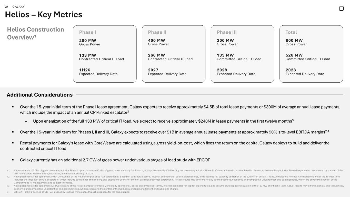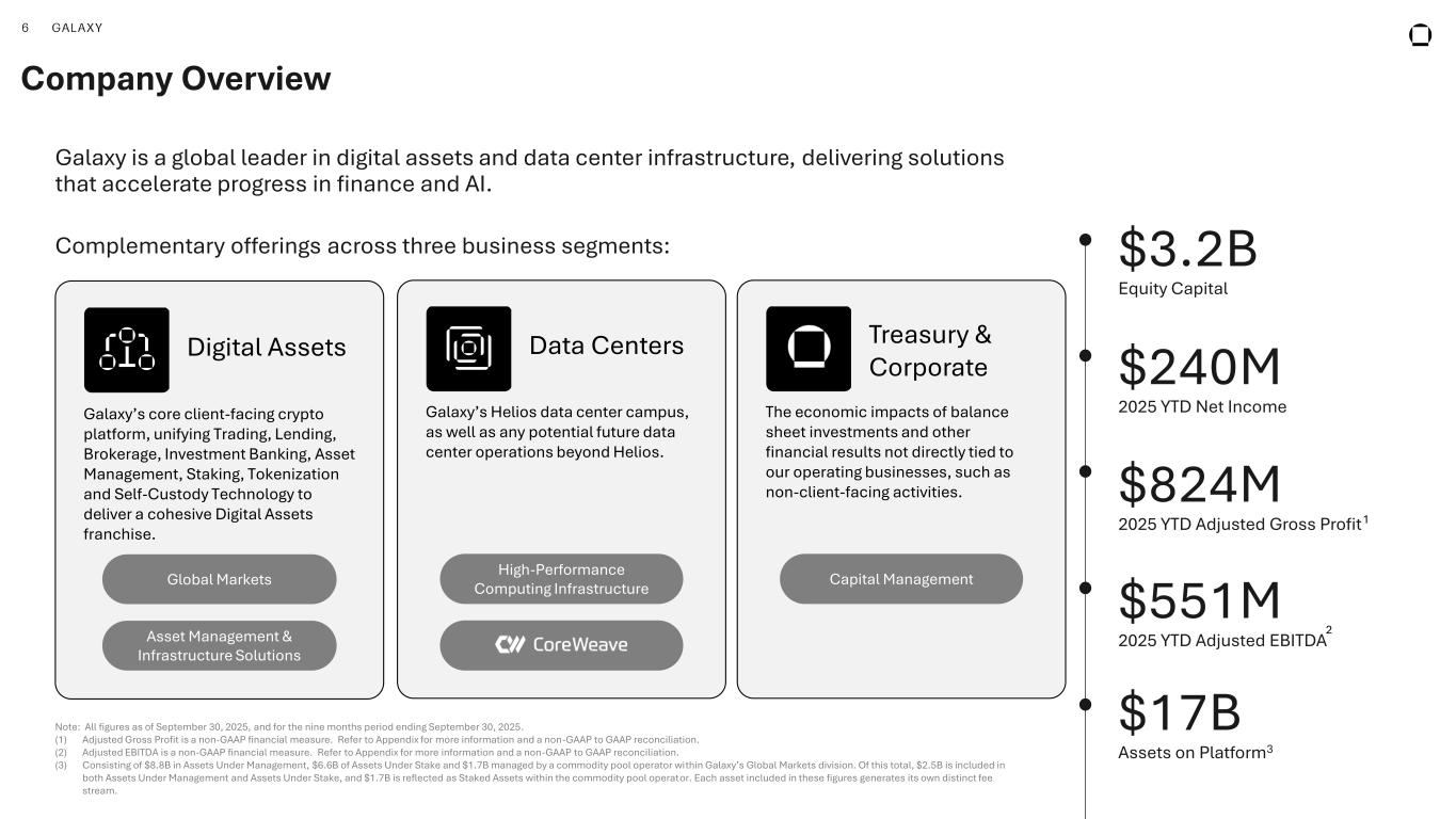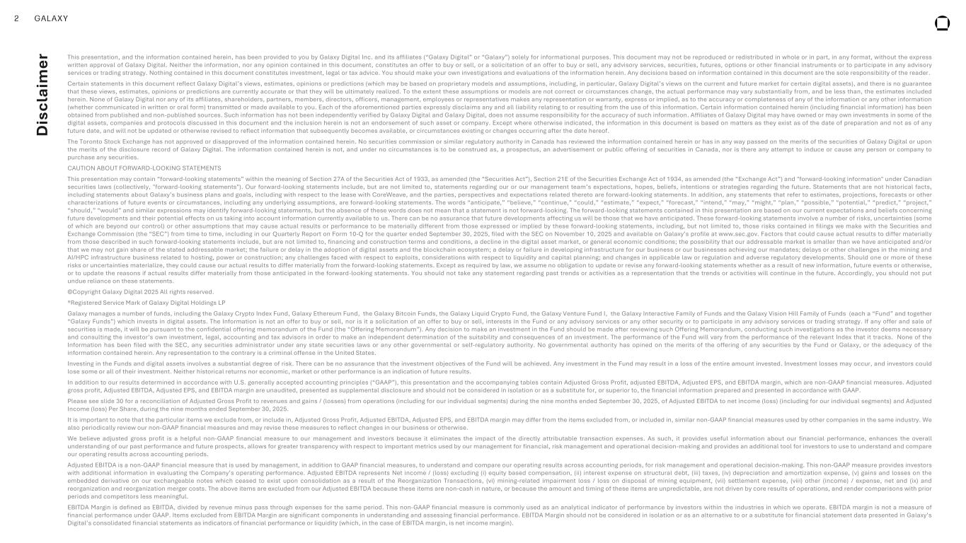 2 GALAXY D is cl ai m er This presentation, and the information contained herein, has been provided to you by Galaxy Digital Inc. and its affiliates (“Galaxy Digital” or “Galaxy”) solely for informational purposes. This document may not be reproduced or redistributed in whole or in part, in any format, without the express written approval of Galaxy Digital. Neither the information, nor any opinion contained in this document, constitutes an offer to buy or sell, or a solicitation of an offer to buy or sell, any advisory services, securities, futures, options or other financial instruments or to participate in any advisory services or trading strategy. Nothing contained in this document constitutes investment, legal or tax advice. You should make your own investigations and evaluations of the information herein. Any decisions based on information contained in this document are the sole responsibility of the reader. Certain statements in this document reflect Galaxy Digital’s views, estimates, opinions or predictions (which may be based on proprietary models and assumptions, including, in particular, Galaxy Digital’s views on the current and future market for certain digital assets), and there is no guarantee that these views, estimates, opinions or predictions are currently accurate or that they will be ultimately realized. To the extent these assumptions or models are not correct or circumstances change, the actual performance may vary substantially from, and be less than, the estimates included herein. None of Galaxy Digital nor any of its affiliates, shareholders, partners, members, directors, officers, management, employees or representatives makes any representation or warranty, express or implied, as to the accuracy or completeness of any of the information or any other information (whether communicated in written or oral form) transmitted or made available to you. Each of the aforementioned parties expressly disclaims any and all liability relating to or resulting from the use of this information. Certain information contained herein (including financial information) has been obtained from published and non-published sources. Such information has not been independently verified by Galaxy Digital and Galaxy Digital, does not assume responsibility for the accuracy of such information. Affiliates of Galaxy Digital may have owned or may own investments in some of the digital assets, companies and protocols discussed in this document and the inclusion herein is not an endorsement of such asset or company. Except where otherwise indicated, the information in this document is based on matters as they exist as of the date of preparation and not as of any future date, and will not be updated or otherwise revised to reflect information that subsequently becomes available, or circumstances existing or changes occurring after the date hereof. The Toronto Stock Exchange has not approved or disapproved of the information contained herein. No securities commission or similar regulatory authority in Canada has reviewed the information contained herein or has in any way passed on the merits of the securities of Galaxy Digital or upon the merits of the disclosure record of Galaxy Digital. The information contained herein is not, and under no circumstances is to be construed as, a prospectus, an advertisement or public offering of securities in Canada, nor is there any attempt to induce or cause any person or company to purchase any securities. CAUTION ABOUT FORWARD-LOOKING STATEMENTS This presentation may contain “forward-looking statements” within the meaning of Section 27A of the Securities Act of 1933, as amended (the “Securities Act”), Section 21E of the Securities Exchange Act of 1934, as amended (the “Exchange Act”) and "forward-looking information" under Canadian securities laws (collectively, "forward-looking statements"). Our forward-looking statements include, but are not limited to, statements regarding our or our management team’s expectations, hopes, beliefs, intentions or strategies regarding the future. Statements that are not historical facts, including statements about Galaxy’s business plans and goals, including with respect to the lease with CoreWeave, and the parties, perspectives and expectations related thereto are forward-looking statements. In addition, any statements that refer to estimates, projections, forecasts or other characterizations of future events or circumstances, including any underlying assumptions, are forward-looking statements. The words “anticipate,” “believe,” “continue,” “could,” “estimate,” “expect,” “forecast,” “intend,” “may,” “might,” “plan,” “possible,” “potential,” “predict,” “project,” “should,” “would” and similar expressions may identify forward-looking statements, but the absence of these words does not mean that a statement is not forward-looking. The forward-looking statements contained in this presentation are based on our current expectations and beliefs concerning future developments and their potential effects on us taking into account information currently available to us. There can be no assurance that future developments affecting us will be those that we have anticipated. These forward-looking statements involve a number of risks, uncertainties (some of which are beyond our control) or other assumptions that may cause actual results or performance to be materially different from those expressed or implied by these forward-looking statements, including, but not limited to, those risks contained in filings we make with the Securities and Exchange Commission (the “SEC”) from time to time, including in our Quarterly Report on Form 10-Q for the quarter ended September 30, 2025, filed with the SEC on November 10, 2025 and available on Galaxy’s profile at www.sec.gov. Factors that could cause actual results to differ materially from those descr