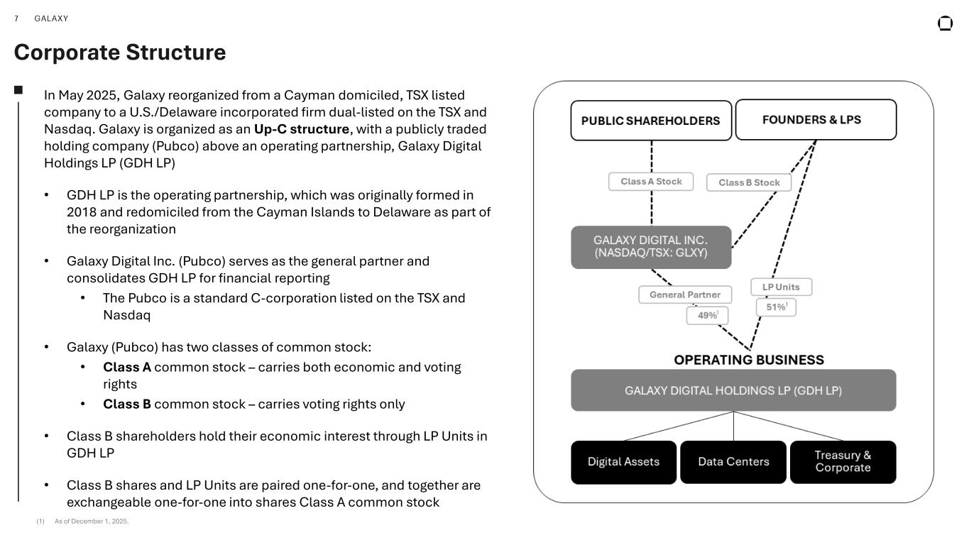 7 GALAXY In May 2025, Galaxy reorganized from a Cayman domiciled, TSX listed company to a U.S./Delaware incorporated firm dual-listed on the TSX and Nasdaq. Galaxy is organized as an Up-C structure, with a publicly traded holding company (Pubco) above an operating partnership, Galaxy Digital Holdings LP (GDH LP) • GDH LP is the operating partnership, which was originally formed in 2018 and redomiciled from the Cayman Islands to Delaware as part of the reorganization • Galaxy Digital Inc. (Pubco) serves as the general partner and consolidates GDH LP for financial reporting • The Pubco is a standard C-corporation listed on the TSX and Nasdaq • Galaxy (Pubco) has two classes of common stock: • Class A common stock – carries both economic and voting rights • Class B common stock – carries voting rights only • Class B shareholders hold their economic interest through LP Units in GDH LP • Class B shares and LP Units are paired one-for-one, and together are exchangeable one-for-one into shares Class A common stock (1) As of December 1, 2025. OPERATING BUSINESS Digital Assets Data Centers Treasury & Corporate GALAXY DIGITAL HOLDINGS LP (GDH LP) PUBLIC SHAREHOLDERS FOUNDERS & LPS 49% 51% GALAXY DIGITAL INC. (NASDAQ/TSX: GLXY) LP Units Class B StockClass A Stock General Partner 1 1 Corporate Structure