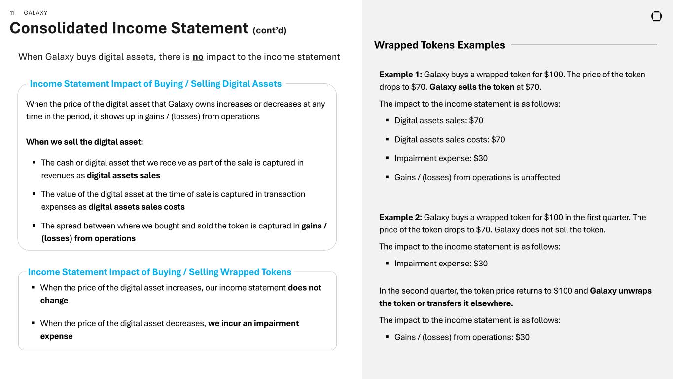 11 GALAXY Consolidated Income Statement (cont’d) Example 1: Galaxy buys a wrapped token for $100. The price of the token drops to $70. Galaxy sells the token at $70. The impact to the income statement is as follows: ▪ Digital assets sales: $70 ▪ Digital assets sales costs: $70 ▪ Impairment expense: $30 ▪ Gains / (losses) from operations is unaffected Example 2: Galaxy buys a wrapped token for $100 in the first quarter. The price of the token drops to $70. Galaxy does not sell the token. The impact to the income statement is as follows: ▪ Impairment expense: $30 In the second quarter, the token price returns to $100 and Galaxy unwraps the token or transfers it elsewhere. The impact to the income statement is as follows: ▪ Gains / (losses) from operations: $30 Wrapped Tokens Examples When the price of the digital asset that Galaxy owns increases or decreases at any time in the period, it shows up in gains / (losses) from operations When we sell the digital asset: ▪ The cash or digital asset that we receive as part of the sale is captured in revenues as digital assets sales ▪ The value of the digital asset at the time of sale is captured in transaction expenses as digital assets sales costs ▪ The spread between where we bought and sold the token is captured in gains / (losses) from operations Income Statement Impact of Buying / Selling Digital Assets ▪ When the price of the digital asset increases, our income statement does not change ▪ When the price of the digital asset decreases, we incur an impairment expense Income Statement Impact of Buying / Selling Wrapped Tokens When Galaxy buys digital assets, there is no impact to the income statement