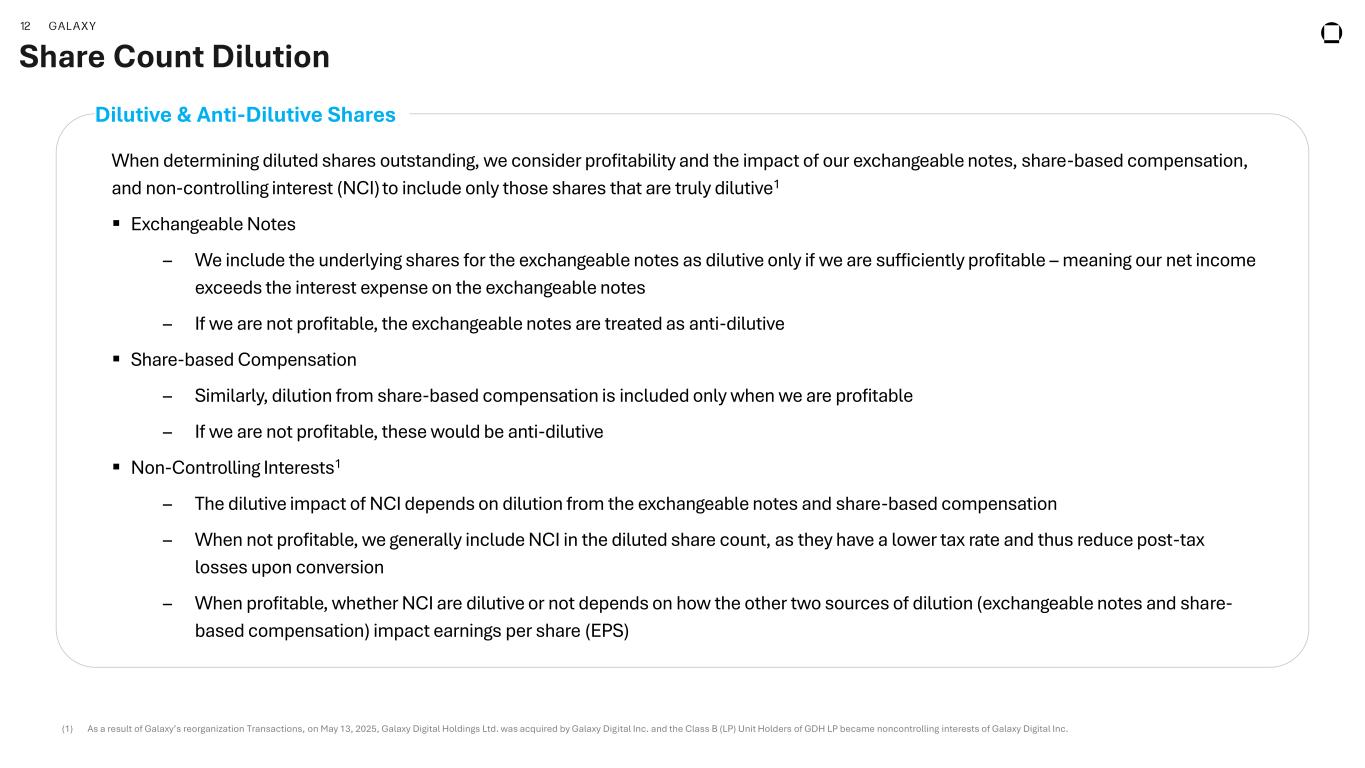12 GALAXY Share Count Dilution Dilutive & Anti-Dilutive Shares When determining diluted shares outstanding, we consider profitability and the impact of our exchangeable notes, share-based compensation, and non-controlling interest (NCI) to include only those shares that are truly dilutive1 ▪ Exchangeable Notes – We include the underlying shares for the exchangeable notes as dilutive only if we are sufficiently profitable – meaning our net income exceeds the interest expense on the exchangeable notes – If we are not profitable, the exchangeable notes are treated as anti-dilutive ▪ Share-based Compensation – Similarly, dilution from share-based compensation is included only when we are profitable – If we are not profitable, these would be anti-dilutive ▪ Non-Controlling Interests1 – The dilutive impact of NCI depends on dilution from the exchangeable notes and share-based compensation – When not profitable, we generally include NCI in the diluted share count, as they have a lower tax rate and thus reduce post-tax losses upon conversion – When profitable, whether NCI are dilutive or not depends on how the other two sources of dilution (exchangeable notes and share- based compensation) impact earnings per share (EPS) (1) As a result of Galaxy’s reorganization Transactions, on May 13, 2025, Galaxy Digital Holdings Ltd. was acquired by Galaxy Digital Inc. and the Class B (LP) Unit Holders of GDH LP became noncontrolling interests of Galaxy Digital Inc.