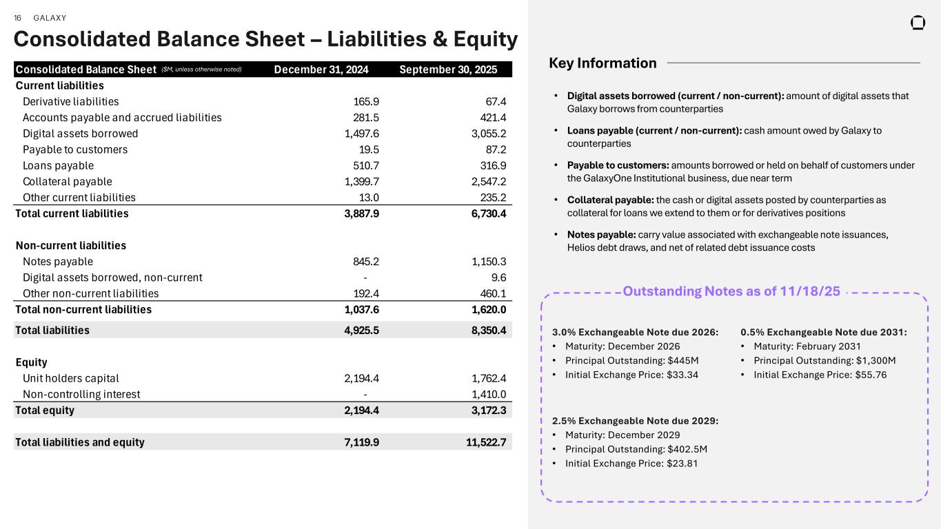 15 GALAXY Consolidated Balance Sheet December 31, 2024 September 30, 2025 Current assets Cash and cash equivalents 462.1 1,137.4 Digital intangible assets 2,547.6 3,785.1 Digital financial assets 359.7 322.9 Digital assets loan receivable, net of allowance 579.5 1,299.7 Assets posted as collateral 277.1 714.9 Investments 834.8 853.8 Derivative assets 207.7 152.6 Accounts receivable 55.3 72.0 Digital assets receivable 53.6 4.6 Loans receivable 476.6 635.4 Prepaid expenses and other assets 26.9 78.9 Total current assets 5,880.9 9,057.2 Non-current assets Digital intangible assets 21.0 56.5 Digital assets receivable 7.1 16.8 Digital assets loan receivable, non-current - - Investments 808.7 1,252.4 Loans receivable, non-current - 7.3 Property and equipment, net 237.0 874.1 Other non-current assets 107.1 195.8 Goodwill 58.0 62.7 Total non-current assets 1,239.0 2,465.5 Total assets 7,119.9 11,522.7 Consolidated Balance Sheet - Assets ▪ Digital intangible assets: coins are classified as digital intangible assets when Galaxy does not have a direct contractual relationship with an issuer that allows them to be redeemed for cash. Examples include bitcoin, ether and sol – Galaxy does not have a contractual right to redeem with certain stablecoin issuers and onchain stablecoin providers, like DAI. In those cases, the coins are classified as digital intangible assets ▪ Digital financial assets: Coins are classified as digital financial assets when Galaxy does have a direct contractual relationship with an issuer that allows them to be redeemed for cash – Examples include USDC and other instruments in regulated vehicles (e.g., treasuries) ▪ Digital assets loan receivables (current / non-current): amounts of digital assets owed to Galaxy by borrowers under lending arrangements ▪ Loans receivable (current / non-current): cash amount owed to Galaxy by borrowers under lending arrangements ▪ Digital assets receivable (current / non-current): digital assets that are yet to be distributed to Galaxy as of period end and are expected to be distributed over time ▪ Investments: equity, fund, and other investment positions, including certain digital asset–related holdings, measured at fair value, net asset value, or under the measurement alternative. Examples include bitcoin and ether ETFs ▪ Property and equipment: infrastructure, land, construction in progress, corporate assets, and other assets associated with Galaxy’s Data Centers business and Mining business Key Information($M, unless otherwise noted)