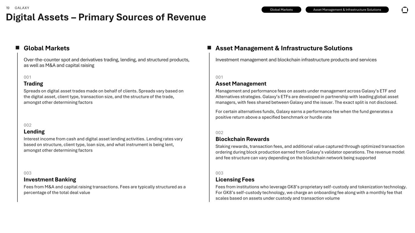 19 GALAXY Digital Assets – Primary Sources of Revenue Over-the-counter spot and derivatives trading, lending, and structured products, as well as M&A and capital raising Investment management and blockchain infrastructure products and services 001 Trading Spreads on digital asset trades made on behalf of clients. Spreads vary based on the digital asset, client type, transaction size, and the structure of the trade, amongst other determining factors 003 Investment Banking Fees from M&A and capital raising transactions. Fees are typically structured as a percentage of the total deal value 002 Lending Interest income from cash and digital asset lending activities. Lending rates vary based on structure, client type, loan size, and what instrument is being lent, amongst other determining factors 001 Asset Management Management and performance fees on assets under management across Galaxy’s ETF and Alternatives strategies. Galaxy’s ETFs are developed in partnership with leading global asset managers, with fees shared between Galaxy and the issuer. The exact split is not disclosed. For certain alternatives funds, Galaxy earns a performance fee when the fund generates a positive return above a specified benchmark or hurdle rate 003 Licensing Fees Fees from institutions who leverage GK8’s proprietary self-custody and tokenization technology. For GK8’s self-custody technology, we charge an onboarding fee along with a monthly fee that scales based on assets under custody and transaction volume 002 Blockchain Rewards Staking rewards, transaction fees, and additional value captured through optimized transaction ordering during block production earned from Galaxy’s validator operations. The revenue model and fee structure can vary depending on the blockchain network being supported Global Markets Asset Management & Infrastructure Solutions Global Markets Asset Management & Infrastructure Solutions