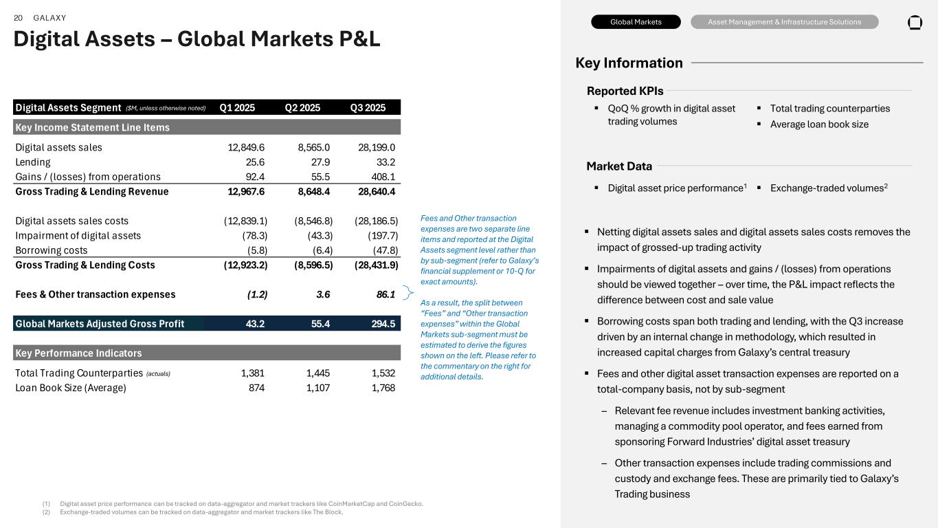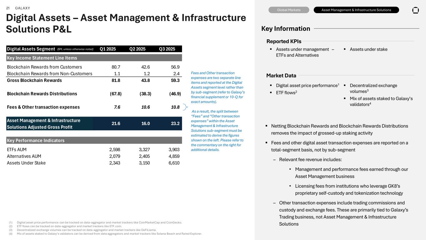20 GALAXY Digital Assets Segment Q1 2025 Q2 2025 Q3 2025 Key Income Statement Line Items Digital assets sales 12,849.6 8,565.0 28,199.0 Lending 25.6 27.9 33.2 Gains / (losses) from operations 92.4 55.5 408.1 Gross Trading & Lending Revenue 12,967.6 8,648.4 28,640.4 Digital assets sales costs (12,839.1) (8,546.8) (28,186.5) Impairment of digital assets (78.3) (43.3) (197.7) Borrowing costs (5.8) (6.4) (47.8) Gross Trading & Lending Costs (12,923.2) (8,596.5) (28,431.9) Fees & Other transaction expenses (1.2) 3.6 86.1 Global Markets Adjusted Gross Profit 43.2 55.4 294.5 Key Performance Indicators Total Trading Counterparties 1,381 1,445 1,532 Loan Book Size (Average) 874 1,107 1,768 Global Markets Asset Management & Infrastructure Solutions Digital Assets – Global Markets P&L ▪ QoQ % growth in digital asset trading volumes ▪ Total trading counterparties ▪ Average loan book size Reported KPIs ▪ Digital asset price performance1 ▪ Exchange-traded volumes2 Market Data ▪ Netting digital assets sales and digital assets sales costs removes the impact of grossed-up trading activity ▪ Impairments of digital assets and gains / (losses) from operations should be viewed together – over time, the P&L impact reflects the difference between cost and sale value ▪ Borrowing costs span both trading and lending, with the Q3 increase driven by an internal change in methodology, which resulted in increased capital charges from Galaxy’s central treasury ▪ Fees and other digital asset transaction expenses are reported on a total-company basis, not by sub-segment – Relevant fee revenue includes investment banking activities, managing a commodity pool operator, and fees earned from sponsoring Forward Industries’ digital asset treasury – Other transaction expenses include trading commissions and custody and exchange fees. These are primarily tied to Galaxy’s Trading business (1) Digital asset price performance can be tracked on data-aggregator and market trackers like CoinMarketCap and CoinGecko. (2) Exchange-traded volumes can be tracked on data-aggregator and market trackers like The Block. Fees and Other transaction expenses are two separate line items and reported at the Digital Assets segment level rather than by sub-segment (refer to Galaxy’s financial supplement or 10-Q for exact amounts). As a result, the split between “Fees” and “Other transaction expenses” within the Global Markets sub-segment must be estimated to derive the figures shown on the left. Please refer to the commentary on the right for additional details. Key Information ($M, unless otherwise noted) (actuals)