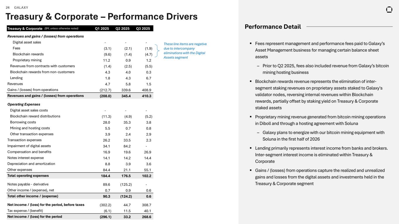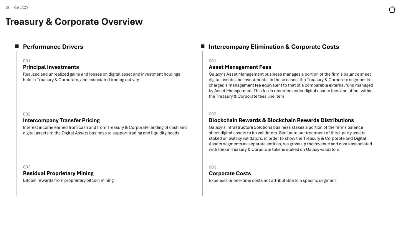 23 GALAXY 001 Principal Investments Realized and unrealized gains and losses on digital asset and investment holdings held in Treasury & Corporate, and associated trading activity 003 Residual Proprietary Mining Bitcoin rewards from proprietary bitcoin mining 001 Asset Management Fees Galaxy’s Asset Management business manages a portion of the firm’s balance sheet digital assets and investments. In these cases, the Treasury & Corporate segment is charged a management fee equivalent to that of a comparable external fund managed by Asset Management. This fee is recorded under digital assets fees and offset within the Treasury & Corporate fees line item 003 Corporate Costs Expenses or one-time costs not attributable to a specific segment 002 Blockchain Rewards & Blockchain Rewards Distributions Galaxy’s Infrastructure Solutions business stakes a portion of the firm’s balance sheet digital assets to its validators. Similar to our treatment of third-party assets staked on Galaxy validators, in order to show the Treasury & Corporate and Digital Assets segments as separate entities, we gross up the revenue and costs associated with these Treasury & Corporate tokens staked on Galaxy validators 002 Intercompany Transfer Pricing Interest income earned from cash and from Treasury & Corporate lending of cash and digital assets to the Digital Assets business to support trading and liquidity needs Performance Drivers Intercompany Elimination & Corporate Costs Treasury & Corporate Overview