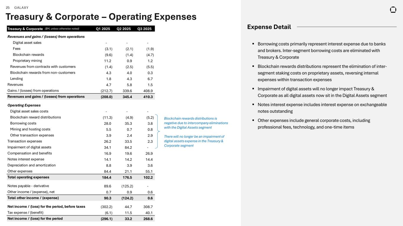 24 GALAXY Treasury & Corporate Q1 2025 Q2 2025 Q3 2025 Revenues and gains / (losses) from operations Digital asset sales - - - Fees (3.1) (2.1) (1.9) Blockchain rewards (9.6) (1.4) (4.7) Proprietary mining 11.2 0.9 1.2 Revenues from contracts with customers (1.4) (2.5) (5.5) Blockchain rewards from non-customers 4.3 4.0 0.3 Lending 1.8 4.3 6.7 Revenues 4.7 5.8 1.5 Gains / (losses) from operations (212.7) 339.6 408.9 Revenues and gains / (losses) from operations (208.0) 345.4 410.3 Operating Expenses Digital asset sales costs - - - Blockchain reward distributions (11.3) (4.9) (5.2) Borrowing costs 28.0 35.3 3.8 Mining and hosting costs 5.5 0.7 0.8 Other transaction expenses 3.9 2.4 2.9 Transaction expenses 26.2 33.5 2.3 Impairment of digital assets 34.1 84.2 - Compensation and benefits 16.9 19.6 26.9 Notes interest expense 14.1 14.2 14.4 Depreciation and amortization 8.8 3.9 3.6 Other expenses 84.4 21.1 55.1 Total operating expenses 184.4 176.5 102.2 Notes payable - derivative 89.6 (125.2) - Other income / (expense), net 0.7 0.9 0.6 Total other income / (expense) 90.3 (124.2) 0.6 Net income / (loss) for the period, before taxes (302.2) 44.7 308.7 Tax expense / (benefit) (6.1) 11.5 40.1 Net income / (loss) for the period (296.1) 33.2 268.6 Treasury & Corporate – Performance Drivers ▪ Fees represent management and performance fees paid to Galaxy’s Asset Management business for managing certain balance sheet assets – Prior to Q2 2025, fees also included revenue from Galaxy’s bitcoin mining hosting business ▪ Blockchain rewards revenue represents the elimination of inter- segment staking revenues on proprietary assets staked to Galaxy's validator nodes, reversing internal revenues within Blockchain rewards, partially offset by staking yield on Treasury & Corporate staked assets ▪ Proprietary mining revenue generated from bitcoin mining operations in Diboll and through a hosting agreement with Soluna – Galaxy plans to energize with our bitcoin mining equipment with Soluna in the first half of 2026 ▪ Lending primarily represents interest income from banks and brokers. Inter-segment interest income is eliminated within Treasury & Corporate ▪ Gains / (losses) from operations capture the realized and unrealized gains and losses from the digital assets and investments held in the Treasury & Corporate segment Performance Detail These line items are negative due to intercompany eliminations with the Digital Assets segment ($M, unless otherwise noted)