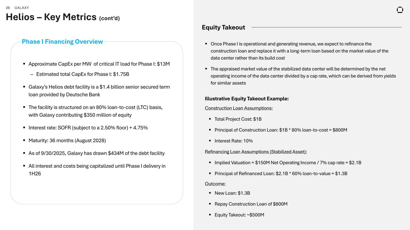 28 GALAXY Helios – Key Metrics (cont’d) ▪ Once Phase I is operational and generating revenue, we expect to refinance the construction loan and replace it with a long-term loan based on the market value of the data center rather than its build cost ▪ The appraised market value of the stabilized data center will be determined by the net operating income of the data center divided by a cap rate, which can be derived from yields for similar assets Illustrative Equity Takeout Example: Construction Loan Assumptions: ▪ Total Project Cost: $1B ▪ Principal of Construction Loan: $1B * 80% loan-to-cost = $800M ▪ Interest Rate: 10% Refinancing Loan Assumptions (Stabilized Asset): ▪ Implied Valuation = $150M Net Operating Income / 7% cap rate = $2.1B ▪ Principal of Refinanced Loan: $2.1B * 60% loan-to-value = $1.3B Outcome: ▪ New Loan: $1.3B ▪ Repay Construction Loan of $800M ▪ Equity Takeout: ~$500M Equity Takeout Phase I Financing Overview ▪ Approximate CapEx per MW of critical IT load for Phase I: $13M – Estimated total CapEx for Phase I: $1.75B ▪ Galaxy’s Helios debt facility is a $1.4 billion senior secured term loan provided by Deutsche Bank ▪ The facility is structured on an 80% loan-to-cost (LTC) basis, with Galaxy contributing $350 million of equity ▪ Interest rate: SOFR (subject to a 2.50% floor) + 4.75% ▪ Maturity: 36 months (August 2028) ▪ As of 9/30/2025, Galaxy has drawn $434M of the debt facility ▪ All interest and costs being capitalized until Phase I delivery in 1H26