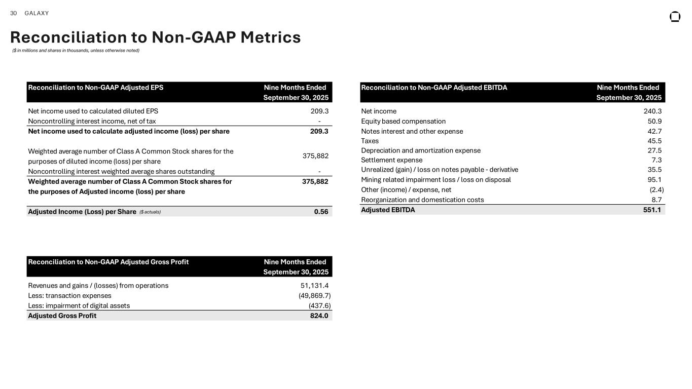 30 GALAXY Reconciliation to Non-GAAP Metrics ($ in millions and shares in thousands, unless otherwise noted) Reconciliation to Non-GAAP Adjusted EPS Nine Months Ended September 30, 2025 Net income used to calculated diluted EPS 209.3 Noncontrolling interest income, net of tax - Net income used to calculate adjusted income (loss) per share 209.3 Weighted average number of Class A Common Stock shares for the purposes of diluted income (loss) per share Noncontrolling interest weighted average shares outstanding - Weighted average number of Class A Common Stock shares for 375,882 the purposes of Adjusted income (loss) per share Adjusted Income (Loss) per Share 0.56 Reconciliation to Non-GAAP Adjusted Gross Profit Nine Months Ended September 30, 2025 Revenues and gains / (losses) from operations 51,131.4 Less: transaction expenses (49,869.7) Less: impairment of digital assets (437.6) Adjusted Gross Profit 824.0 375,882 Reconciliation to Non-GAAP Adjusted EBITDA Nine Months Ended September 30, 2025 Net income 240.3 Equity based compensation 50.9 Notes interest and other expense 42.7 Taxes 45.5 Depreciation and amortization expense 27.5 Settlement expense 7.3 Unrealized (gain) / loss on notes payable - derivative 35.5 Mining related impairment loss / loss on disposal 95.1 Other (income) / expense, net (2.4) Reorganization and domestication costs 8.7 Adjusted EBITDA 551.1 ($ actuals)