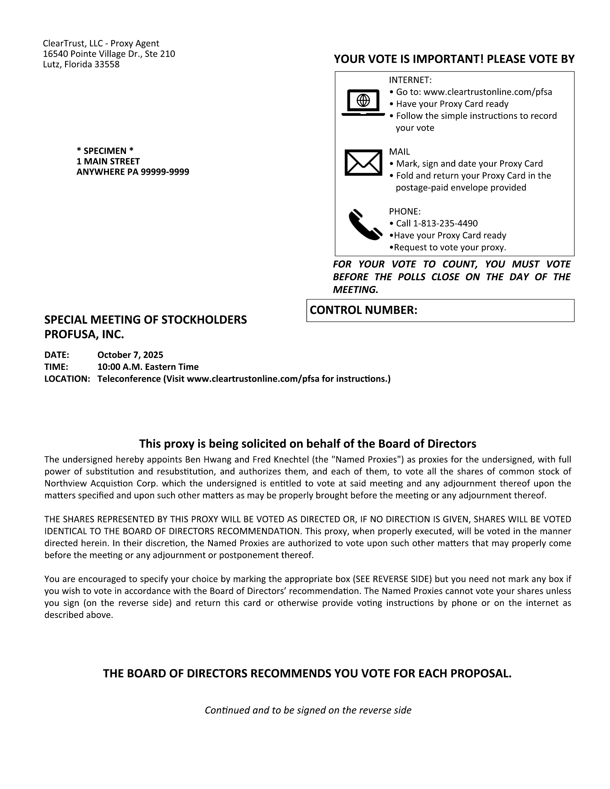 ClearTrust, LLC - Proxy Agent 16540 Pointe Village Dr., Ste 210 Lutz, Florida 33558 * SPECIMEN * 1 MAIN STREET ANYWHERE PA 99999-9999 YOUR VOTE IS IMPORTANT! PLEASE VOTE BY INTERNET: Go to: www.cleartrustonline.com/pfsa Have your Proxy Card ready Follow the simple instructions to record your vote MAIL Mark, sign and date your Proxy Card Fold and return your Proxy Card in the postage-paid envelope provided PHONE: Call 1-813-235-4490 Have your Proxy Card ready Request to vote your proxy. FOR YOUR VOTE TO COUNT, YOU MUST VOTE BEFORE THE POLLS CLOSE ON THE DAY OF THE MEETING. CONTROL NUMBER: SPECIAL MEETING OF STOCKHOLDERS PROFUSA, INC. DATE: October 7, 2025 TIME: 10:00 A.M. Eastern Time LOCATION: Teleconference (Visit www.cleartrustonline.com/pfsa for instructions.) This proxy is being solicited on behalf of the Board of Directors The undersigned hereby appoints Ben Hwang and Fred Knechtel (the “Named Proxies”) as proxies for the undersigned, with full power of substitution and resubstitution, and authorizes them, and each of them, to vote all the shares of common stock of Northview Acquistion Corp. which the undersigned is entitled to vote at said meeting and any adjournment thereof upon the matters specified and upon such other matters as may be properly brought before the meeting or any adjournment thereof. THE SHARES REPRESENTED BY THIS PROXY WILL BE VOTED AS DIRECTED OR, IF NO DIRECTION IS GIVEN, SHARES WILL BE VOTED IDENTICAL TO THE BOARD OF DIRECTORS RECOMMENDATION. This proxy, when properly executed, will be voted in the manner directed herein. In their discretion, the Named Proxies are authorized to vote upon such other matters that may properly come before the meeting or any adjournment or postponement thereof. You are encouraged to specify your choice by marking the appropriate box (SEE REVERSE SIDE) but you need not mark any box if you wish to vote in accordance with the Board of Directors’ recommendation. The Named Proxies cannot vote your shares unless you sign (on the reverse side) and return this card or otherwise provide voting instructions by phone or on the internet as described above. THE BOARD OF DIRECTORS RECOMMENDS YOU VOTE FOR EACH PROPOSAL. Continued and to be signed on the reverse side