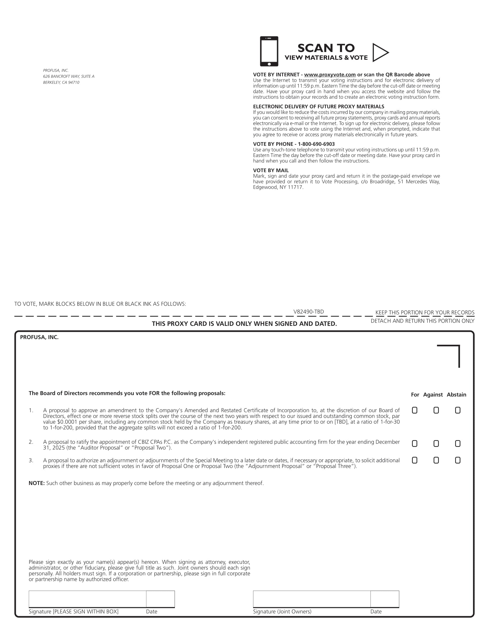 Signature [PLEASE SIGN WITHIN BOX] Date Signature (Joint Owners) Date TO VOTE, MARK BLOCKS BELOW IN BLUE OR BLACK INK AS FOLLOWS: KEEP THIS PORTION FOR YOUR RECORDS DETACH AND RETURN THIS PORTION ONLY THIS PROXY CARD IS VALID ONLY WHEN SIGNED AND DATED. V82490 - TBD 1 . A proposal to approve an amendment to the Company’s Amended and Restated Certificate of Incorporation, as amended to, at the discretion of our Board of Directors, effect a reverse stock split with respect to our issued and outstanding common stock, par value $ 0 . 0001 per share, including any common stock held by the Company as treasury shares, at any time prior to or on [TBD], 2025 , at a ratio of 1 - for - 30 to 1 - for - 100 (the “Range”), with the ratio within such Range to be determined at the discretion of our Board of Directors . 2. A proposal to authorize an adjournment or adjournments of the Special Meeting to a later date or dates, if necessary or appropriate, to solicit additional proxies if there are not sufficient votes in favor of Proposal One. For Against Abstain O O O O O O PROFUSA, INC. The Board of Directors recommends you vote FOR the following proposals: PROFUSA, INC. 5959 HORTON STREET, SUITE 450 EMERYVILLE, CA 94608 USA NOTE: Such other business as may properly come before the meeting or any adjournment thereof. Please sign exactly as your name(s) appear(s) hereon . When signing as attorney, executor, administrator, or other fiduciary, please give full title as such . Joint owners should each sign personally . All holders must sign . If a corporation or partnership, please sign in full corporate or partnership name by authorized officer . VOTE BY INTERNET - www.proxyvote.com or scan the QR Barcode above Use the Internet to transmit your voting instructions and for electronic delivery of information up until 11 : 59 p . m . Eastern Time the day before the cut - off date or meeting date . Have your proxy card in hand when you access the website and follow the instructions to obtain your records and to create an electronic voting instruction form . ELECTRONIC DELIVERY OF FUTURE PROXY MATERIALS If you would like to reduce the costs incurred by our company in mailing proxy materials, you can consent to receiving all future proxy statements, proxy cards and annual reports electronically via e - mail or the Internet . To sign up for electronic delivery, please follow the instructions above to vote using the Internet and, when prompted, indicate that you agree to receive or access proxy materials electronically in future years . VOTE BY PHONE - 1 - 800 - 690 - 6903 Use any touch - tone telephone to transmit your voting instructions up until 11 : 59 p . m . Eastern Time the day before the cut - off date or meeting date . Have your proxy card in hand when you call and then follow the instructions . VOTE BY MAIL Mark, sign and date your proxy card and return it in the postage - paid envelope we have provided or return it to Vote Processing, c/o Broadridge, 51 Mercedes Way, Edgewood, NY 11717 . SCAN TO VIEW MATERIALS & VOTE ڀ