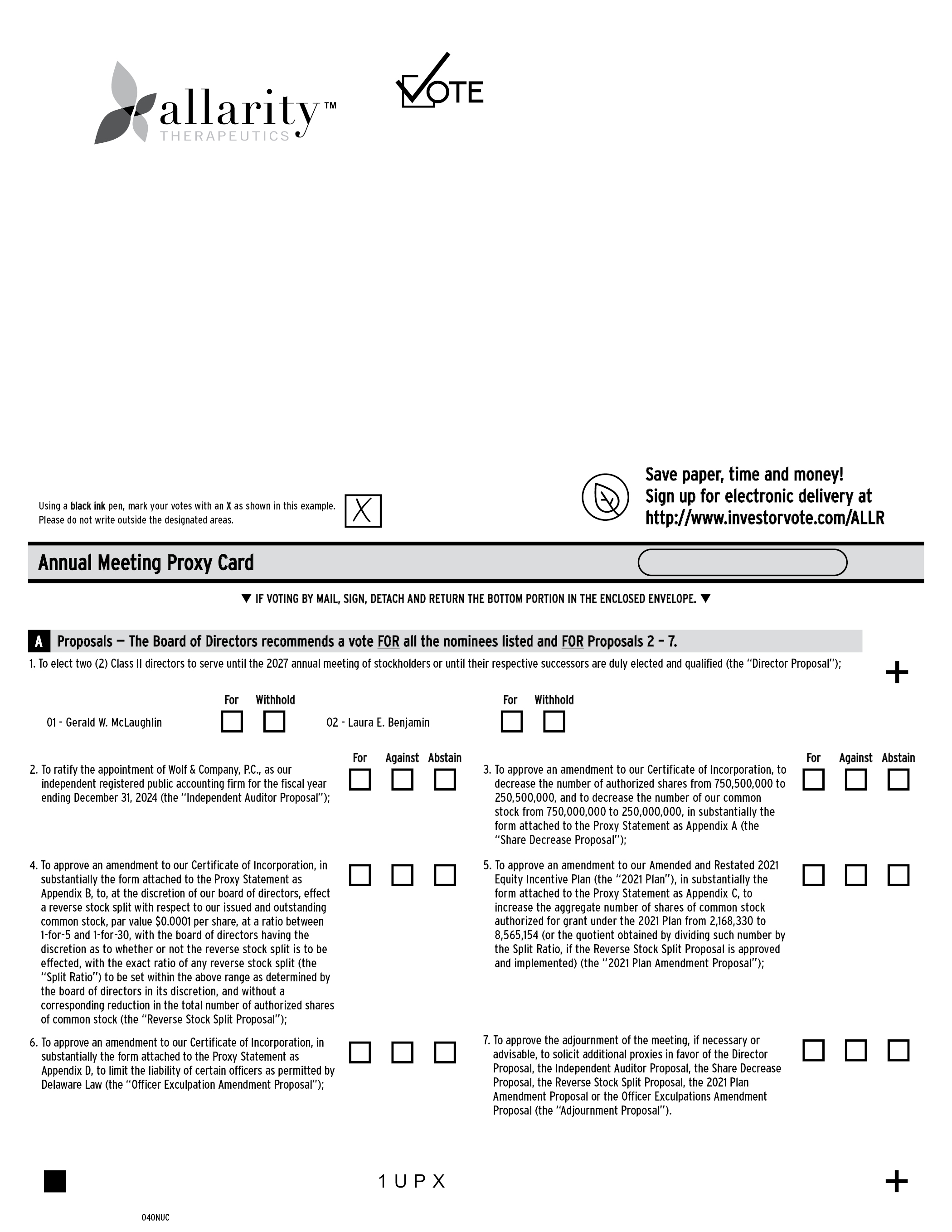 For Against Abstain Save paper, time and money! Sign up for electronic delivery at http://www.investorvote.com/ALLR Small steps make an impact. Help the environment by consenting to receive electronic delivery, sign up at http://www.investorvote.com/ALLR Notice of the Annual Meeting of Stockholders Proxy Solicited by Board of Directors for Annual Meeting — July 26, 2024 Thomas H. Jensen and Joan Y. Brown, or any of them, each with the power of substitution, are hereby authorized to represent and vote the shares of the undersigned, with all the powers which the undersigned would possess if personally present, at the Annual Meeting of Stockholders of Allarity Therapeutics, Inc. to be held on July 26, 2024 or at any postponement or adjournment thereof. Shares represented by this proxy will be voted by the stockholder. If no such directions are indicated, the Proxies will have authority to vote FOR each Class II Director Nominee in Proposal 1, and FOR Proposals 2 through 7. In their discretion, the Proxies are authorized to vote upon such other business as may properly come before the meeting. (Items to be voted appear on reverse side) Allarity Therapeutics, Inc. qIF VOTING BY MAIL, SIGN, DETACH AND RETURN THE BOTTOM PORTION IN THE ENCLOSED ENVELOPE.q Please sign exactly as name(s) appears hereon. Joint owners should each sign. When signing as attorney, executor, administrator, corporate officer, trustee, guardian, or custodian, please give full title. Date (mm/dd/yyyy) — Please print date below. Signature 1 — Please keep signature within the box. Signature 2 — Please keep signature within the box. B Authorized Signatures — This section must be completed for your vote to count. Please date and sign below. Important notice regarding the Internet availability of proxy materials for the Annual Meeting of Stockholders. The proxy materials are available at: https://www.edocumentview.com/ALLR2024 The Annual Meeting of Stockholders of Allarity Therapeutics, Inc. will be held on Friday, July 26, 2024, at 10:00 a.m., Eastern Time, via live audio webcast at https://meetnow.global/MHULKLQ To access the virtual Annual Meeting, you must have the information that is printed in the shaded bar located on the reverse side of this form. Annual Meeting Admission Ticket The Annual Meeting of Stockholders of Allarity Therapeutics, Inc. Friday, July 26, 2024, at 10:00 a.m., Eastern Time Virtual Meeting You are cordially invited to attend the virtual Annual Meeting of Stockholders of Allarity Therapeutics, Inc., via the Internet. It is important that your shares are represented at the Annual Meeting. Even if you plan to attend the Annual Meeting live via the Internet, we hope that you will promptly vote and submit your proxy by dating, signing, and returning the enclosed proxy card if you receive a paper proxy card, or vote via the Internet or by telephone. This will not limit your rights to attend or vote during the Annual Meeting. Please note, however, that if your shares are held of record by a broker, bank, or other agent and you wish to vote at the meeting, you must obtain a proxy issued in your name from that record holder.