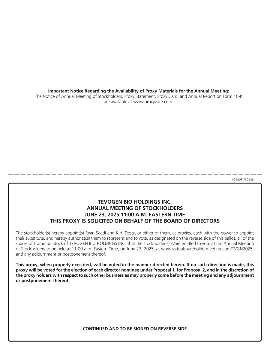 You are cordially invited to attend the 2025 Annual Meeting of the Stockholders (the “Annual Meeting”) of Tevogen Bio Holdings Inc. (the “Company”). The Annual Meeting will be held on June 23, 2025, commencing at 11:00 a.m. Eastern Time, and will be a completely virtual meeting of stockholders.