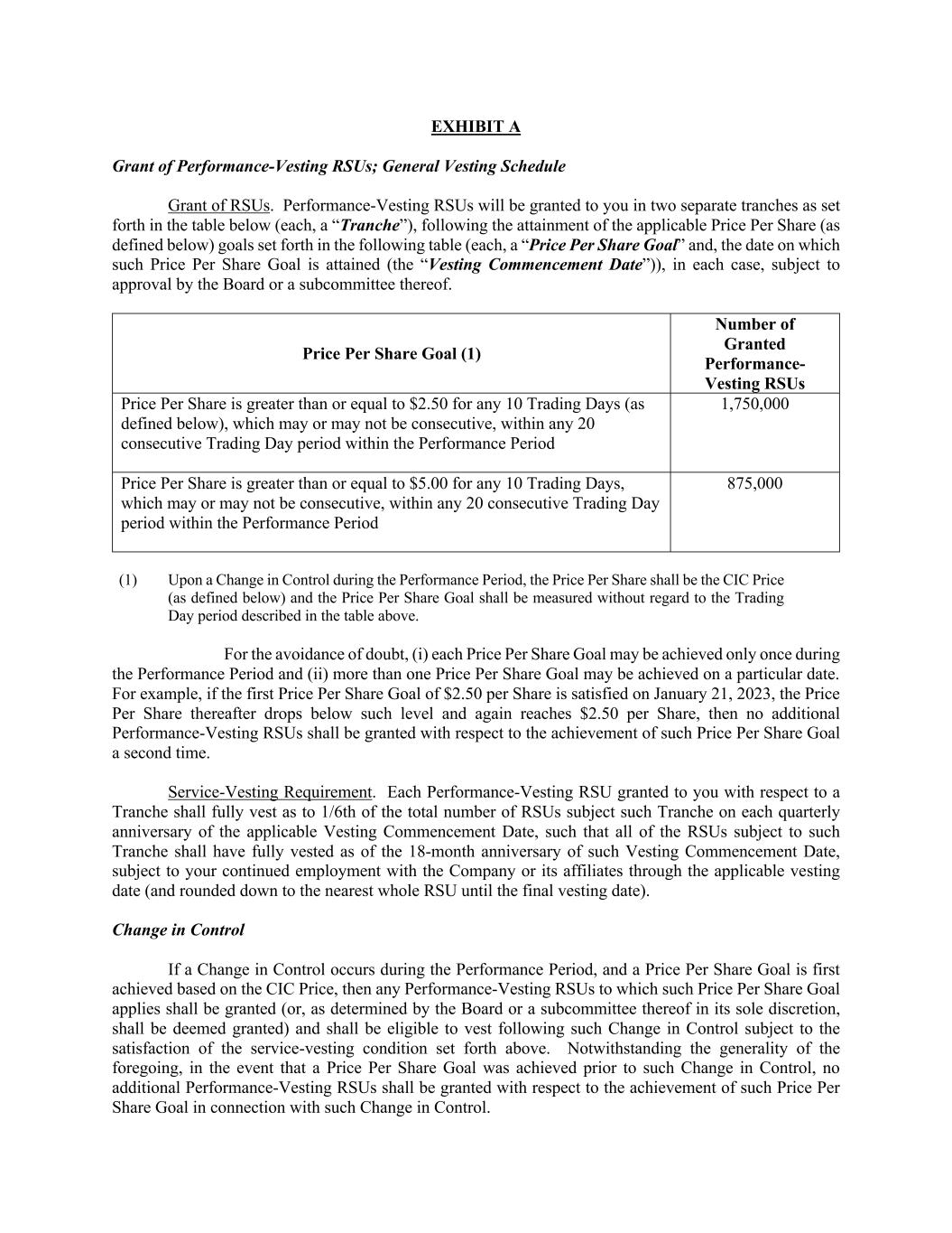 EXHIBIT A Grant of Performance-Vesting RSUs; General Vesting Schedule Grant of RSUs. Performance-Vesting RSUs will be granted to you in two separate tranches as set forth in the table below (each, a “Tranche”), following the attainment of the applicable Price Per Share (as defined below) goals set forth in the following table (each, a “Price Per Share Goal” and, the date on which such Price Per Share Goal is attained (the “Vesting Commencement Date”)), in each case, subject to approval by the Board or a subcommittee thereof. Price Per Share Goal (1) Number of Granted Performance- Vesting RSUs Price Per Share is greater than or equal to $2.50 for any 10 Trading Days (as defined below), which may or may not be consecutive, within any 20 consecutive Trading Day period within the Performance Period 1,750,000 Price Per Share is greater than or equal to $5.00 for any 10 Trading Days, which may or may not be consecutive, within any 20 consecutive Trading Day period within the Performance Period 875,000 (1) Upon a Change in Control during the Performance Period, the Price Per Share shall be the CIC Price (as defined below) and the Price Per Share Goal shall be measured without regard to the Trading Day period described in the table above. For the avoidance of doubt, (i) each Price Per Share Goal may be achieved only once during the Performance Period and (ii) more than one Price Per Share Goal may be achieved on a particular date. For example, if the first Price Per Share Goal of $2.50 per Share is satisfied on January 21, 2023, the Price Per Share thereafter drops below such level and again reaches $2.50 per Share, then no additional Performance-Vesting RSUs shall be granted with respect to the achievement of such Price Per Share Goal a second time. Service-Vesting Requirement. Each Performance-Vesting RSU granted to you with respect to a Tranche shall fully vest as to 1/6th of the total number of RSUs subject such Tranche on each quarterly anniversary of the applicable Vesting Commencement Date, such that all of the RSUs subject to such Tranche shall have fully vested as of the 18-month anniversary of such Vesting Commencement Date, subject to your continued employment with the Company or its affiliates through the applicable vesting date (and rounded down to the nearest whole RSU until the final vesting date). Change in Control If a Change in Control occurs during the Performance Period, and a Price Per Share Goal is first achieved based on the CIC Price, then any Performance-Vesting RSUs to which such Price Per Share Goal applies shall be granted (or, as determined by the Board or a subcommittee thereof in its sole discretion, shall be deemed granted) and shall be eligible to vest following such Change in Control subject to the satisfaction of the service-vesting condition set forth above. Notwithstanding the generality of the foregoing, in the event that a Price Per Share Goal was achieved prior to such Change in Control, no additional Performance-Vesting RSUs shall be granted with respect to the achievement of such Price Per Share Goal in connection with such Change in Control.