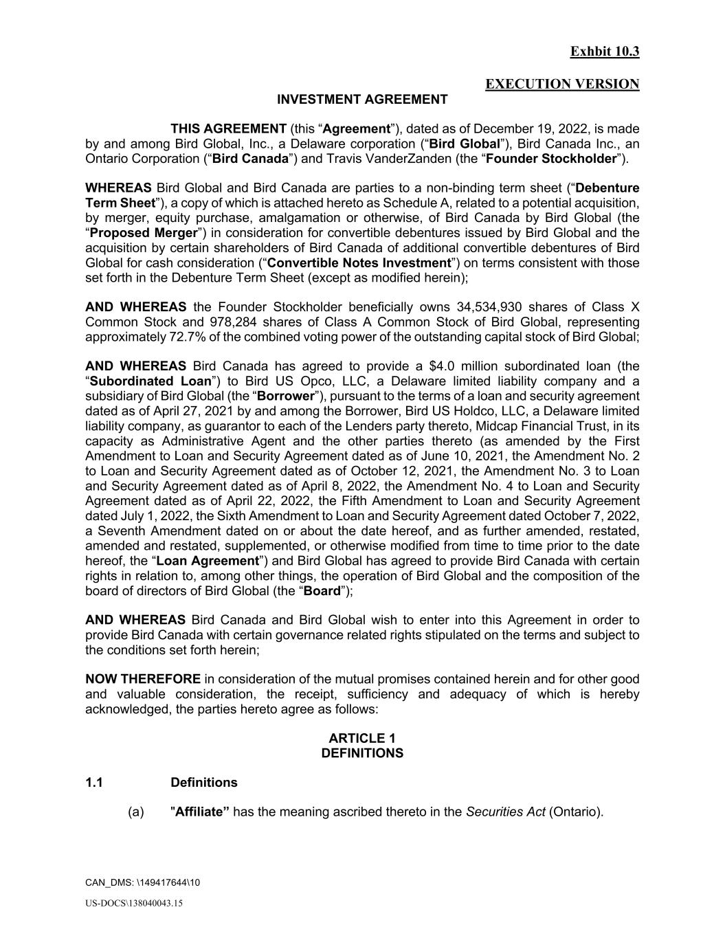 Exhbit 10.3 EXECUTION VERSION US-DOCS\138040043.15 CAN_DMS: \149417644\10 INVESTMENT AGREEMENT THIS AGREEMENT (this “Agreement”), dated as of December 19, 2022, is made by and among Bird Global, Inc., a Delaware corporation (“Bird Global”), Bird Canada Inc., an Ontario Corporation (“Bird Canada”) and Travis VanderZanden (the “Founder Stockholder”). WHEREAS Bird Global and Bird Canada are parties to a non-binding term sheet (“Debenture Term Sheet”), a copy of which is attached hereto as Schedule A, related to a potential acquisition, by merger, equity purchase, amalgamation or otherwise, of Bird Canada by Bird Global (the “Proposed Merger”) in consideration for convertible debentures issued by Bird Global and the acquisition by certain shareholders of Bird Canada of additional convertible debentures of Bird Global for cash consideration (“Convertible Notes Investment”) on terms consistent with those set forth in the Debenture Term Sheet (except as modified herein); AND WHEREAS the Founder Stockholder beneficially owns 34,534,930 shares of Class X Common Stock and 978,284 shares of Class A Common Stock of Bird Global, representing approximately 72.7% of the combined voting power of the outstanding capital stock of Bird Global; AND WHEREAS Bird Canada has agreed to provide a $4.0 million subordinated loan (the “Subordinated Loan”) to Bird US Opco, LLC, a Delaware limited liability company and a subsidiary of Bird Global (the “Borrower”), pursuant to the terms of a loan and security agreement dated as of April 27, 2021 by and among the Borrower, Bird US Holdco, LLC, a Delaware limited liability company, as guarantor to each of the Lenders party thereto, Midcap Financial Trust, in its capacity as Administrative Agent and the other parties thereto (as amended by the First Amendment to Loan and Security Agreement dated as of June 10, 2021, the Amendment No. 2 to Loan and Security Agreement dated as of October 12, 2021, the Amendment No. 3 to Loan and Security Agreement dated as of April 8, 2022, the Amendment No. 4 to Loan and Security Agreement dated as of April 22, 2022, the Fifth Amendment to Loan and Security Agreement dated July 1, 2022, the Sixth Amendment to Loan and Security Agreement dated October 7, 2022, a Seventh Amendment dated on or about the date hereof, and as further amended, restated, amended and restated, supplemented, or otherwise modified from time to time prior to the date hereof, the “Loan Agreement”) and Bird Global has agreed to provide Bird Canada with certain rights in relation to, among other things, the operation of Bird Global and the composition of the board of directors of Bird Global (the “Board”); AND WHEREAS Bird Canada and Bird Global wish to enter into this Agreement in order to provide Bird Canada with certain governance related rights stipulated on the terms and subject to the conditions set forth herein; NOW THEREFORE in consideration of the mutual promises contained herein and for other good and valuable consideration, the receipt, sufficiency and adequacy of which is hereby acknowledged, the parties hereto agree as follows: ARTICLE 1 DEFINITIONS 1.1 Definitions (a) "Affiliate” has the meaning ascribed thereto in the Securities Act (Ontario).
