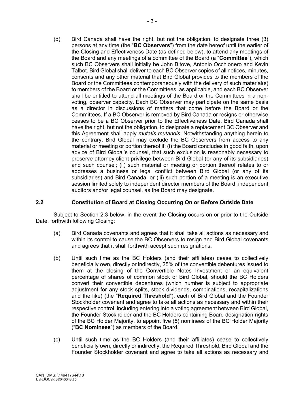 - 3 - US-DOCS\138040043.15 CAN_DMS: \149417644\10 (d) Bird Canada shall have the right, but not the obligation, to designate three (3) persons at any time (the “BC Observers”) from the date hereof until the earlier of the Closing and Effectiveness Date (as defined below), to attend any meetings of the Board and any meetings of a committee of the Board (a “Committee”), which such BC Observers shall initially be John Bitove, Antonio Occhionero and Kevin Talbot. Bird Global shall deliver to each BC Observer copies of all notices, minutes, consents and any other material that Bird Global provides to the members of the Board or the Committees contemporaneously with the delivery of such material(s) to members of the Board or the Committees, as applicable, and each BC Observer shall be entitled to attend all meetings of the Board or the Committees in a non- voting, observer capacity. Each BC Observer may participate on the same basis as a director in discussions of matters that come before the Board or the Committees. If a BC Observer is removed by Bird Canada or resigns or otherwise ceases to be a BC Observer prior to the Effectiveness Date, Bird Canada shall have the right, but not the obligation, to designate a replacement BC Observer and this Agreement shall apply mutatis mutandis. Notwithstanding anything herein to the contrary, Bird Global may exclude the BC Observers from access to any material or meeting or portion thereof if: (i) the Board concludes in good faith, upon advice of Bird Global’s counsel, that such exclusion is reasonably necessary to preserve attorney-client privilege between Bird Global (or any of its subsidiaries) and such counsel; (ii) such material or meeting or portion thereof relates to or addresses a business or legal conflict between Bird Global (or any of its subsidiaries) and Bird Canada; or (iii) such portion of a meeting is an executive session limited solely to independent director members of the Board, independent auditors and/or legal counsel, as the Board may designate. 2.2 Constitution of Board at Closing Occurring On or Before Outside Date Subject to Section 2.3 below, in the event the Closing occurs on or prior to the Outside Date, forthwith following Closing: (a) Bird Canada covenants and agrees that it shall take all actions as necessary and within its control to cause the BC Observers to resign and Bird Global covenants and agrees that it shall forthwith accept such resignations. (b) Until such time as the BC Holders (and their affiliates) cease to collectively beneficially own, directly or indirectly, 25% of the convertible debentures issued to them at the closing of the Convertible Notes Investment or an equivalent percentage of shares of common stock of Bird Global, should the BC Holders convert their convertible debentures (which number is subject to appropriate adjustment for any stock splits, stock dividends, combinations, recapitalizations and the like) (the “Required Threshold”), each of Bird Global and the Founder Stockholder covenant and agree to take all actions as necessary and within their respective control, including entering into a voting agreement between Bird Global, the Founder Stockholder and the BC Holders containing Board designation rights of the BC Holder Majority, to appoint five (5) nominees of the BC Holder Majority (“BC Nominees”) as members of the Board. (c) Until such time as the BC Holders (and their affiliates) cease to collectively beneficially own, directly or indirectly, the Required Threshold, Bird Global and the Founder Stockholder covenant and agree to take all actions as necessary and