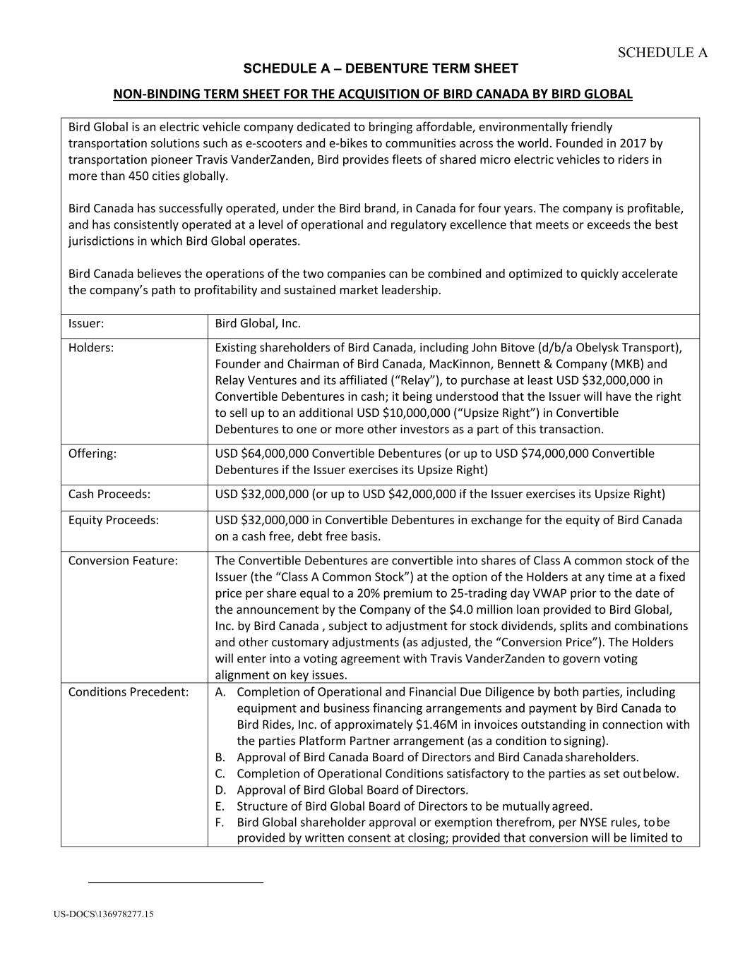 SCHEDULE A US-DOCS\136978277.15 SCHEDULE A – DEBENTURE TERM SHEET NON-BINDING TERM SHEET FOR THE ACQUISITION OF BIRD CANADA BY BIRD GLOBAL Bird Global is an electric vehicle company dedicated to bringing affordable, environmentally friendly transportation solutions such as e-scooters and e-bikes to communities across the world. Founded in 2017 by transportation pioneer Travis VanderZanden, Bird provides fleets of shared micro electric vehicles to riders in more than 450 cities globally. Bird Canada has successfully operated, under the Bird brand, in Canada for four years. The company is profitable, and has consistently operated at a level of operational and regulatory excellence that meets or exceeds the best jurisdictions in which Bird Global operates. Bird Canada believes the operations of the two companies can be combined and optimized to quickly accelerate the company’s path to profitability and sustained market leadership. Issuer: Bird Global, Inc. Holders: Existing shareholders of Bird Canada, including John Bitove (d/b/a Obelysk Transport), Founder and Chairman of Bird Canada, MacKinnon, Bennett & Company (MKB) and Relay Ventures and its affiliated (“Relay”), to purchase at least USD $32,000,000 in Convertible Debentures in cash; it being understood that the Issuer will have the right to sell up to an additional USD $10,000,000 (“Upsize Right”) in Convertible Debentures to one or more other investors as a part of this transaction. Offering: USD $64,000,000 Convertible Debentures (or up to USD $74,000,000 Convertible Debentures if the Issuer exercises its Upsize Right) Cash Proceeds: USD $32,000,000 (or up to USD $42,000,000 if the Issuer exercises its Upsize Right) Equity Proceeds: USD $32,000,000 in Convertible Debentures in exchange for the equity of Bird Canada on a cash free, debt free basis. Conversion Feature: The Convertible Debentures are convertible into shares of Class A common stock of the Issuer (the “Class A Common Stock”) at the option of the Holders at any time at a fixed price per share equal to a 20% premium to 25-trading day VWAP prior to the date of the announcement by the Company of the $4.0 million loan provided to Bird Global, Inc. by Bird Canada , subject to adjustment for stock dividends, splits and combinations and other customary adjustments (as adjusted, the “Conversion Price”). The Holders will enter into a voting agreement with Travis VanderZanden to govern voting alignment on key issues. Conditions Precedent: A. Completion of Operational and Financial Due Diligence by both parties, including equipment and business financing arrangements and payment by Bird Canada to Bird Rides, Inc. of approximately $1.46M in invoices outstanding in connection with the parties Platform Partner arrangement (as a condition to signing). B. Approval of Bird Canada Board of Directors and Bird Canada shareholders. C. Completion of Operational Conditions satisfactory to the parties as set out below. D. Approval of Bird Global Board of Directors. E. Structure of Bird Global Board of Directors to be mutually agreed. F. Bird Global shareholder approval or exemption therefrom, per NYSE rules, to be provided by written consent at closing; provided that conversion will be limited to