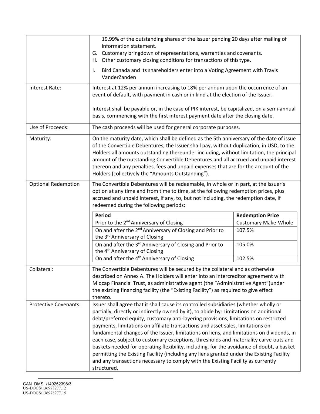 US-DOCS\136978277.12 US-DOCS\136978277.15 CAN_DMS: \149252398\3 19.99% of the outstanding shares of the Issuer pending 20 days after mailing of information statement. G. Customary bringdown of representations, warranties and covenants. H. Other customary closing conditions for transactions of this type. I. Bird Canada and its shareholders enter into a Voting Agreement with Travis VanderZanden Interest Rate: Interest at 12% per annum increasing to 18% per annum upon the occurrence of an event of default, with payment in cash or in kind at the election of the Issuer. Interest shall be payable or, in the case of PIK interest, be capitalized, on a semi-annual basis, commencing with the first interest payment date after the closing date. Use of Proceeds: The cash proceeds will be used for general corporate purposes. Maturity: On the maturity date, which shall be defined as the 5th anniversary of the date of issue of the Convertible Debentures, the Issuer shall pay, without duplication, in USD, to the Holders all amounts outstanding thereunder including, without limitation, the principal amount of the outstanding Convertible Debentures and all accrued and unpaid interest thereon and any penalties, fees and unpaid expenses that are for the account of the Holders (collectively the “Amounts Outstanding”). Optional Redemption The Convertible Debentures will be redeemable, in whole or in part, at the Issuer’s option at any time and from time to time, at the following redemption prices, plus accrued and unpaid interest, if any, to, but not including, the redemption date, if redeemed during the following periods: Collateral: The Convertible Debentures will be secured by the collateral and as otherwise described on Annex A. The Holders will enter into an intercreditor agreement with Midcap Financial Trust, as administrative agent (the “Administrative Agent”)under the existing financing facility (the “Existing Facility”) as required to give effect thereto. Protective Covenants: Issuer shall agree that it shall cause its controlled subsidiaries (whether wholly or partially, directly or indirectly owned by it), to abide by: Limitations on additional debt/preferred equity, customary anti-layering provisions, limitations on restricted payments, limitations on affiliate transactions and asset sales, limitations on fundamental changes of the Issuer, limitations on liens, and limitations on dividends, in each case, subject to customary exceptions, thresholds and materiality carve-outs and baskets needed for operating flexibility, including, for the avoidance of doubt, a basket permitting the Existing Facility (including any liens granted under the Existing Facility and any transactions necessary to comply with the Existing Facility as currently structured, Period Redemption Price Prior to the 2nd Anniversary of Closing Customary Make-Whole On and after the 2nd Anniversary of Closing and Prior to the 3rd Anniversary of Closing 107.5% On and after the 3rd Anniversary of Closing and Prior to the 4th Anniversary of Closing 105.0% On and after the 4th Anniversary of Closing 102.5%