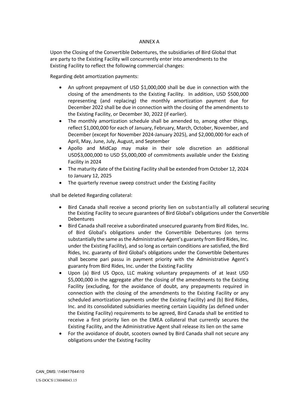 US-DOCS\138040043.15 CAN_DMS: \149417644\10 ANNEX A Upon the Closing of the Convertible Debentures, the subsidiaries of Bird Global that are party to the Existing Facility will concurrently enter into amendments to the Existing Facility to reflect the following commercial changes: Regarding debt amortization payments: • An upfront prepayment of USD $1,000,000 shall be due in connection with the closing of the amendments to the Existing Facility. In addition, USD $500,000 representing (and replacing) the monthly amortization payment due for December 2022 shall be due in connection with the closing of the amendments to the Existing Facility, or December 30, 2022 (if earlier). • The monthly amortization schedule shall be amended to, among other things, reflect $1,000,000 for each of January, February, March, October, November, and December (except for November 2024-January 2025), and $2,000,000 for each of April, May, June, July, August, and September • Apollo and MidCap may make in their sole discretion an additional USD$3,000,000 to USD $5,000,000 of commitments available under the Existing Facility in 2024 • The maturity date of the Existing Facility shall be extended from October 12, 2024 to January 12, 2025 • The quarterly revenue sweep construct under the Existing Facility shall be deleted Regarding collateral: • Bird Canada shall receive a second priority lien on substantially all collateral securing the Existing Facility to secure guarantees of Bird Global’s obligations under the Convertible Debentures • Bird Canada shall receive a subordinated unsecured guaranty from Bird Rides, Inc. of Bird Global’s obligations under the Convertible Debentures (on terms substantially the same as the Administrative Agent’s guaranty from Bird Rides, Inc. under the Existing Facility), and so long as certain conditions are satisfied, the Bird Rides, Inc. guaranty of Bird Global’s obligations under the Convertible Debentures shall become pari passu in payment priority with the Administrative Agent’s guaranty from Bird Rides, Inc. under the Existing Facility • Upon (a) Bird US Opco, LLC making voluntary prepayments of at least USD $5,000,000 in the aggregate after the closing of the amendments to the Existing Facility (excluding, for the avoidance of doubt, any prepayments required in connection with the closing of the amendments to the Existing Facility or any scheduled amortization payments under the Existing Facility) and (b) Bird Rides, Inc. and its consolidated subsidiaries meeting certain Liquidity (as defined under the Existing Facility) requirements to be agreed, Bird Canada shall be entitled to receive a first priority lien on the EMEA collateral that currently secures the Existing Facility, and the Administrative Agent shall release its lien on the same • For the avoidance of doubt, scooters owned by Bird Canada shall not secure any obligations under the Existing Facility