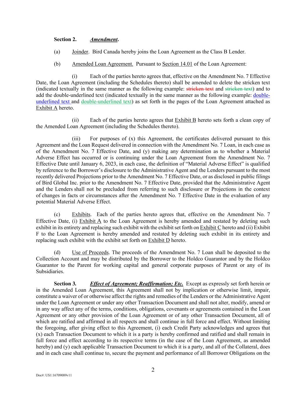 2 Doc#: US1:16709089v11 Section 2. Amendment. (a) Joinder. Bird Canada hereby joins the Loan Agreement as the Class B Lender. (b) Amended Loan Agreement. Pursuant to Section 14.01 of the Loan Agreement: (i) Each of the parties hereto agrees that, effective on the Amendment No. 7 Effective Date, the Loan Agreement (including the Schedules thereto) shall be amended to delete the stricken text (indicated textually in the same manner as the following example: stricken text and stricken text) and to add the double-underlined text (indicated textually in the same manner as the following example: double- underlined text and double-underlined text) as set forth in the pages of the Loan Agreement attached as Exhibit A hereto. (ii) Each of the parties hereto agrees that Exhibit B hereto sets forth a clean copy of the Amended Loan Agreement (including the Schedules thereto). (iii) For purposes of (x) this Agreement, the certificates delivered pursuant to this Agreement and the Loan Request delivered in connection with the Amendment No. 7 Loan, in each case as of the Amendment No. 7 Effective Date, and (y) making any determination as to whether a Material Adverse Effect has occurred or is continuing under the Loan Agreement from the Amendment No. 7 Effective Date until January 6, 2023, in each case, the definition of “Material Adverse Effect” is qualified by reference to the Borrower’s disclosure to the Administrative Agent and the Lenders pursuant to the most recently delivered Projections prior to the Amendment No. 7 Effective Date, or as disclosed in public filings of Bird Global Inc. prior to the Amendment No. 7 Effective Date, provided that the Administrative Agent and the Lenders shall not be precluded from referring to such disclosure or Projections in the context of changes in facts or circumstances after the Amendment No. 7 Effective Date in the evaluation of any potential Material Adverse Effect. (c) Exhibits. Each of the parties hereto agrees that, effective on the Amendment No. 7 Effective Date, (i) Exhibit A to the Loan Agreement is hereby amended and restated by deleting such exhibit in its entirety and replacing such exhibit with the exhibit set forth on Exhibit C hereto and (ii) Exhibit F to the Loan Agreement is hereby amended and restated by deleting such exhibit in its entirety and replacing such exhibit with the exhibit set forth on Exhibit D hereto. (d) Use of Proceeds. The proceeds of the Amendment No. 7 Loan shall be deposited to the Collection Account and may be distributed by the Borrower to the Holdco Guarantor and by the Holdco Guarantor to the Parent for working capital and general corporate purposes of Parent or any of its Subsidiaries. Section 3. Effect of Agreement; Reaffirmation; Etc. Except as expressly set forth herein or in the Amended Loan Agreement, this Agreement shall not by implication or otherwise limit, impair, constitute a waiver of or otherwise affect the rights and remedies of the Lenders or the Administrative Agent under the Loan Agreement or under any other Transaction Document and shall not alter, modify, amend or in any way affect any of the terms, conditions, obligations, covenants or agreements contained in the Loan Agreement or any other provision of the Loan Agreement or of any other Transaction Document, all of which are ratified and affirmed in all respects and shall continue in full force and effect. Without limiting the foregoing, after giving effect to this Agreement, (i) each Credit Party acknowledges and agrees that (x) each Transaction Document to which it is a party is hereby confirmed and ratified and shall remain in full force and effect according to its respective terms (in the case of the Loan Agreement, as amended hereby) and (y) each applicable Transaction Document to which it is a party, and all of the Collateral, does and in each case shall continue to, secure the payment and performance of all Borrower Obligations on the
