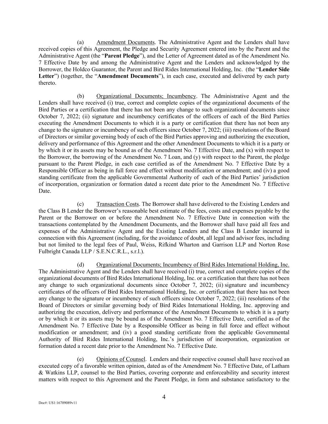 4 Doc#: US1:16709089v11 (a) Amendment Documents. The Administrative Agent and the Lenders shall have received copies of this Agreement, the Pledge and Security Agreement entered into by the Parent and the Administrative Agent (the “Parent Pledge”), and the Letter of Agreement dated as of the Amendment No. 7 Effective Date by and among the Administrative Agent and the Lenders and acknowledged by the Borrower, the Holdco Guarantor, the Parent and Bird Rides International Holding, Inc. (the “Lender Side Letter”) (together, the “Amendment Documents”), in each case, executed and delivered by each party thereto. (b) Organizational Documents; Incumbency. The Administrative Agent and the Lenders shall have received (i) true, correct and complete copies of the organizational documents of the Bird Parties or a certification that there has not been any change to such organizational documents since October 7, 2022; (ii) signature and incumbency certificates of the officers of each of the Bird Parties executing the Amendment Documents to which it is a party or certification that there has not been any change to the signature or incumbency of such officers since October 7, 2022; (iii) resolutions of the Board of Directors or similar governing body of each of the Bird Parties approving and authorizing the execution, delivery and performance of this Agreement and the other Amendment Documents to which it is a party or by which it or its assets may be bound as of the Amendment No. 7 Effective Date, and (x) with respect to the Borrower, the borrowing of the Amendment No. 7 Loan, and (y) with respect to the Parent, the pledge pursuant to the Parent Pledge, in each case certified as of the Amendment No. 7 Effective Date by a Responsible Officer as being in full force and effect without modification or amendment; and (iv) a good standing certificate from the applicable Governmental Authority of each of the Bird Parties’ jurisdiction of incorporation, organization or formation dated a recent date prior to the Amendment No. 7 Effective Date. (c) Transaction Costs. The Borrower shall have delivered to the Existing Lenders and the Class B Lender the Borrower’s reasonable best estimate of the fees, costs and expenses payable by the Parent or the Borrower on or before the Amendment No. 7 Effective Date in connection with the transactions contemplated by the Amendment Documents, and the Borrower shall have paid all fees and expenses of the Administrative Agent and the Existing Lenders and the Class B Lender incurred in connection with this Agreement (including, for the avoidance of doubt, all legal and advisor fees, including but not limited to the legal fees of Paul, Weiss, Rifkind Wharton and Garrison LLP and Norton Rose Fulbright Canada LLP / S.E.N.C.R.L., s.r.l.). (d) Organizational Documents; Incumbency of Bird Rides International Holding, Inc. The Administrative Agent and the Lenders shall have received (i) true, correct and complete copies of the organizational documents of Bird Rides International Holding, Inc. or a certification that there has not been any change to such organizational documents since October 7, 2022; (ii) signature and incumbency certificates of the officers of Bird Rides International Holding, Inc. or certification that there has not been any change to the signature or incumbency of such officers since October 7, 2022; (iii) resolutions of the Board of Directors or similar governing body of Bird Rides International Holding, Inc. approving and authorizing the execution, delivery and performance of the Amendment Documents to which it is a party or by which it or its assets may be bound as of the Amendment No. 7 Effective Date, certified as of the Amendment No. 7 Effective Date by a Responsible Officer as being in full force and effect without modification or amendment; and (iv) a good standing certificate from the applicable Governmental Authority of Bird Rides International Holding, Inc.’s jurisdiction of incorporation, organization or formation dated a recent date prior to the Amendment No. 7 Effective Date. (e) Opinions of Counsel. Lenders and their respective counsel shall have received an executed copy of a favorable written opinion, dated as of the Amendment No. 7 Effective Date, of Latham & Watkins LLP, counsel to the Bird Parties, covering corporate and enforceability and security interest matters with respect to this Agreement and the Parent Pledge, in form and substance satisfactory to the