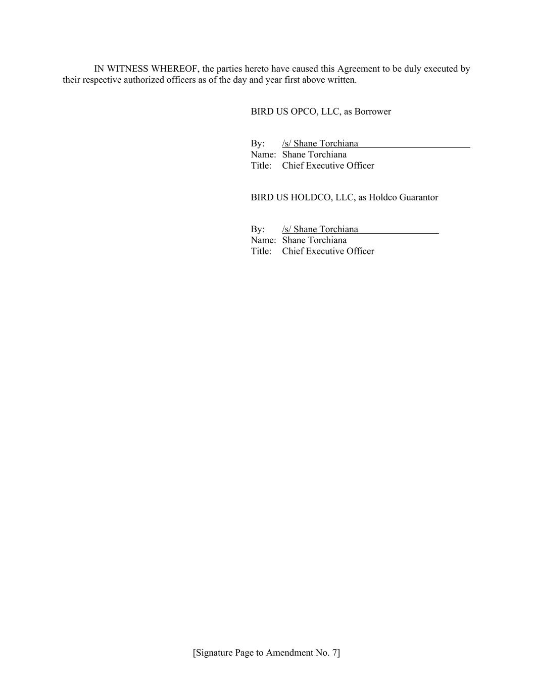 [Signature Page to Amendment No. 7] IN WITNESS WHEREOF, the parties hereto have caused this Agreement to be duly executed by their respective authorized officers as of the day and year first above written. BIRD US OPCO, LLC, as Borrower By: /s/ Shane Torchiana Name: Shane Torchiana Title: Chief Executive Officer BIRD US HOLDCO, LLC, as Holdco Guarantor By: /s/ Shane Torchiana Name: Shane Torchiana Title: Chief Executive Officer