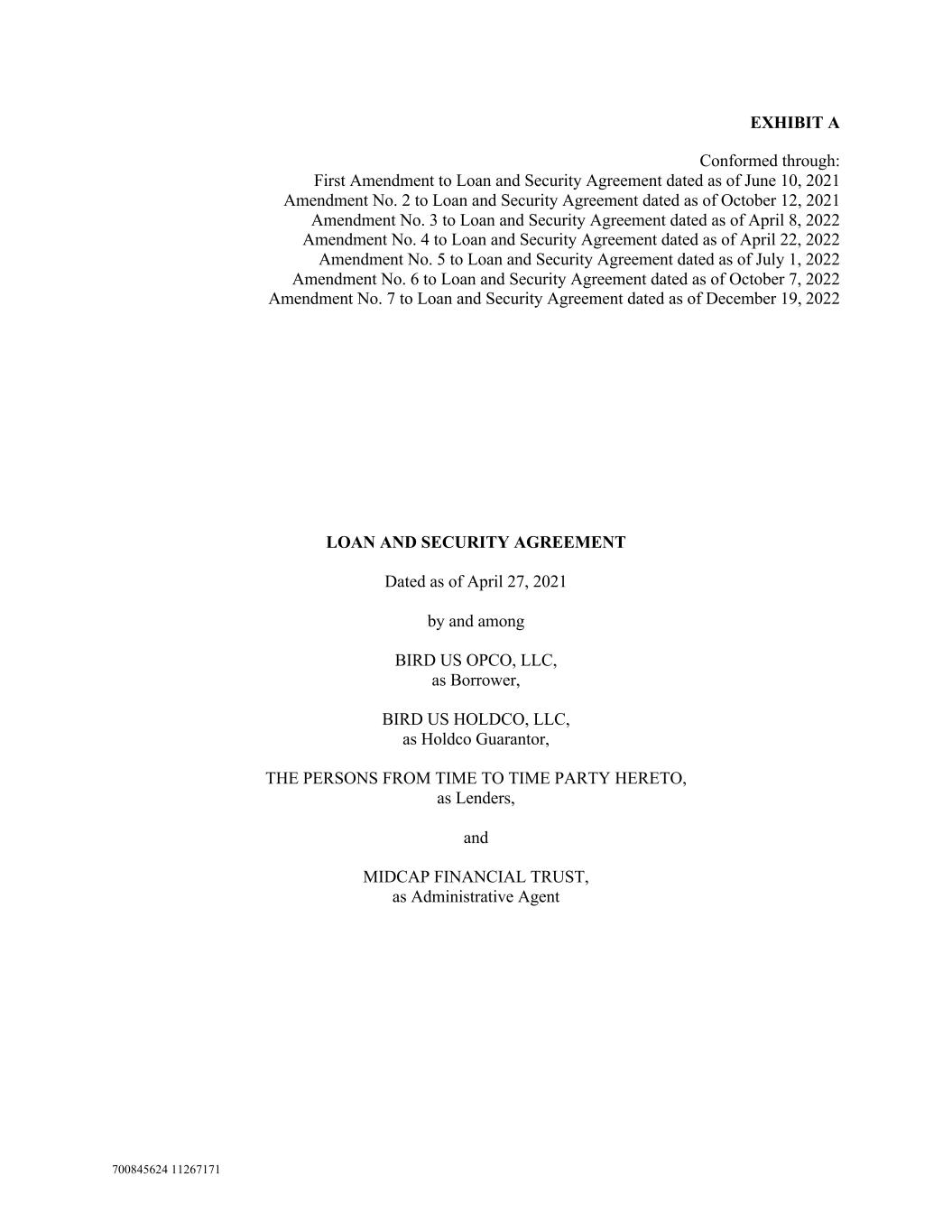 700845624 11267171 EXHIBIT A Conformed through: First Amendment to Loan and Security Agreement dated as of June 10, 2021 Amendment No. 2 to Loan and Security Agreement dated as of October 12, 2021 Amendment No. 3 to Loan and Security Agreement dated as of April 8, 2022 Amendment No. 4 to Loan and Security Agreement dated as of April 22, 2022 Amendment No. 5 to Loan and Security Agreement dated as of July 1, 2022 Amendment No. 6 to Loan and Security Agreement dated as of October 7, 2022 Amendment No. 7 to Loan and Security Agreement dated as of December 19, 2022 LOAN AND SECURITY AGREEMENT Dated as of April 27, 2021 by and among BIRD US OPCO, LLC, as Borrower, BIRD US HOLDCO, LLC, as Holdco Guarantor, THE PERSONS FROM TIME TO TIME PARTY HERETO, as Lenders, and MIDCAP FINANCIAL TRUST, as Administrative Agent