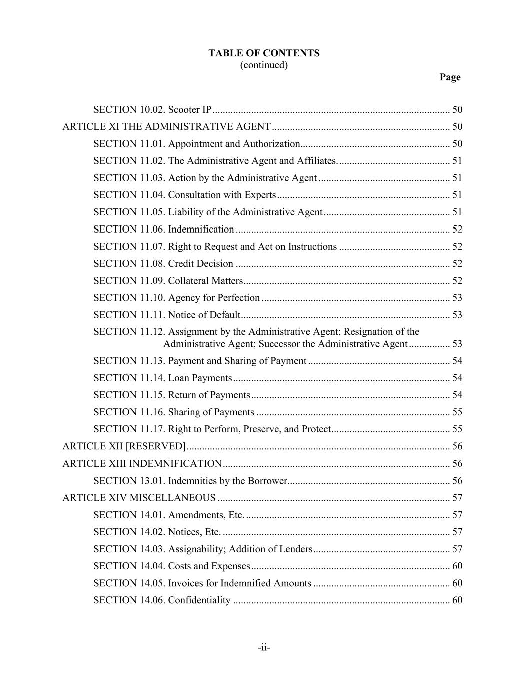 TABLE OF CONTENTS (continued) Page -ii- SECTION 10.02. Scooter IP ............................................................................................ 50 ARTICLE XI THE ADMINISTRATIVE AGENT ..................................................................... 50 SECTION 11.01. Appointment and Authorization .......................................................... 50 SECTION 11.02. The Administrative Agent and Affiliates. ........................................... 51 SECTION 11.03. Action by the Administrative Agent ................................................... 51 SECTION 11.04. Consultation with Experts ................................................................... 51 SECTION 11.05. Liability of the Administrative Agent ................................................. 51 SECTION 11.06. Indemnification ................................................................................... 52 SECTION 11.07. Right to Request and Act on Instructions ........................................... 52 SECTION 11.08. Credit Decision ................................................................................... 52 SECTION 11.09. Collateral Matters ................................................................................ 52 SECTION 11.10. Agency for Perfection ......................................................................... 53 SECTION 11.11. Notice of Default ................................................................................. 53 SECTION 11.12. Assignment by the Administrative Agent; Resignation of the Administrative Agent; Successor the Administrative Agent ................ 53 SECTION 11.13. Payment and Sharing of Payment ....................................................... 54 SECTION 11.14. Loan Payments .................................................................................... 54 SECTION 11.15. Return of Payments ............................................................................. 54 SECTION 11.16. Sharing of Payments ........................................................................... 55 SECTION 11.17. Right to Perform, Preserve, and Protect .............................................. 55 ARTICLE XII [RESERVED] ...................................................................................................... 56 ARTICLE XIII INDEMNIFICATION ........................................................................................ 56 SECTION 13.01. Indemnities by the Borrower ............................................................... 56 ARTICLE XIV MISCELLANEOUS .......................................................................................... 57 SECTION 14.01. Amendments, Etc. ............................................................................... 57 SECTION 14.02. Notices, Etc. ........................................................................................ 57 SECTION 14.03. Assignability; Addition of Lenders ..................................................... 57 SECTION 14.04. Costs and Expenses ............................................................................. 60 SECTION 14.05. Invoices for Indemnified Amounts ..................................................... 60 SECTION 14.06. Confidentiality .................................................................................... 60