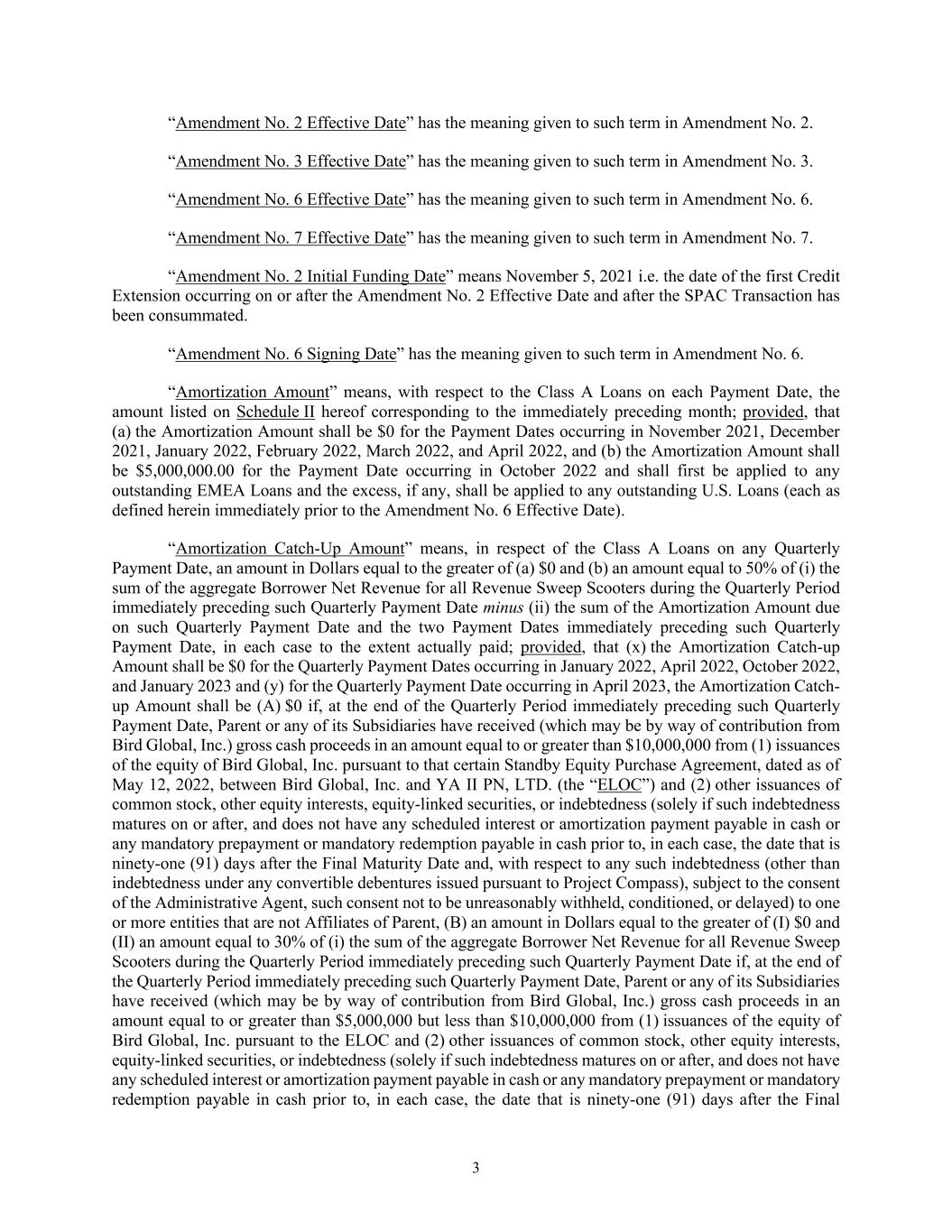 3 “Amendment No. 2 Effective Date” has the meaning given to such term in Amendment No. 2. “Amendment No. 3 Effective Date” has the meaning given to such term in Amendment No. 3. “Amendment No. 6 Effective Date” has the meaning given to such term in Amendment No. 6. “Amendment No. 7 Effective Date” has the meaning given to such term in Amendment No. 7. “Amendment No. 2 Initial Funding Date” means November 5, 2021 i.e. the date of the first Credit Extension occurring on or after the Amendment No. 2 Effective Date and after the SPAC Transaction has been consummated. “Amendment No. 6 Signing Date” has the meaning given to such term in Amendment No. 6. “Amortization Amount” means, with respect to the Class A Loans on each Payment Date, the amount listed on Schedule II hereof corresponding to the immediately preceding month; provided, that (a) the Amortization Amount shall be $0 for the Payment Dates occurring in November 2021, December 2021, January 2022, February 2022, March 2022, and April 2022, and (b) the Amortization Amount shall be $5,000,000.00 for the Payment Date occurring in October 2022 and shall first be applied to any outstanding EMEA Loans and the excess, if any, shall be applied to any outstanding U.S. Loans (each as defined herein immediately prior to the Amendment No. 6 Effective Date). “Amortization Catch-Up Amount” means, in respect of the Class A Loans on any Quarterly Payment Date, an amount in Dollars equal to the greater of (a) $0 and (b) an amount equal to 50% of (i) the sum of the aggregate Borrower Net Revenue for all Revenue Sweep Scooters during the Quarterly Period immediately preceding such Quarterly Payment Date minus (ii) the sum of the Amortization Amount due on such Quarterly Payment Date and the two Payment Dates immediately preceding such Quarterly Payment Date, in each case to the extent actually paid; provided, that (x) the Amortization Catch-up Amount shall be $0 for the Quarterly Payment Dates occurring in January 2022, April 2022, October 2022, and January 2023 and (y) for the Quarterly Payment Date occurring in April 2023, the Amortization Catch- up Amount shall be (A) $0 if, at the end of the Quarterly Period immediately preceding such Quarterly Payment Date, Parent or any of its Subsidiaries have received (which may be by way of contribution from Bird Global, Inc.) gross cash proceeds in an amount equal to or greater than $10,000,000 from (1) issuances of the equity of Bird Global, Inc. pursuant to that certain Standby Equity Purchase Agreement, dated as of May 12, 2022, between Bird Global, Inc. and YA II PN, LTD. (the “ELOC”) and (2) other issuances of common stock, other equity interests, equity-linked securities, or indebtedness (solely if such indebtedness matures on or after, and does not have any scheduled interest or amortization payment payable in cash or any mandatory prepayment or mandatory redemption payable in cash prior to, in each case, the date that is ninety-one (91) days after the Final Maturity Date and, with respect to any such indebtedness (other than indebtedness under any convertible debentures issued pursuant to Project Compass), subject to the consent of the Administrative Agent, such consent not to be unreasonably withheld, conditioned, or delayed) to one or more entities that are not Affiliates of Parent, (B) an amount in Dollars equal to the greater of (I) $0 and (II) an amount equal to 30% of (i) the sum of the aggregate Borrower Net Revenue for all Revenue Sweep Scooters during the Quarterly Period immediately preceding such Quarterly Payment Date if, at the end of the Quarterly Period immediately preceding such Quarterly Payment Date, Parent or any of its Subsidiaries have received (which may be by way of contribution from Bird Global, Inc.) gross cash proceeds in an amount equal to or greater than $5,000,000 but less than $10,000,000 from (1) issuances of the equity of Bird Global, Inc. pursuant to the ELOC and (2) other issuances of common stock, other equity interests, equity-linked securities, or indebtedness (solely if such indebtedness matures on or after, and does not have any scheduled interest or amortization payment payable in cash or any mandatory prepayment or mandatory redemption payable in cash prior to, in each case, the date that is ninety-one (91) days after the Final