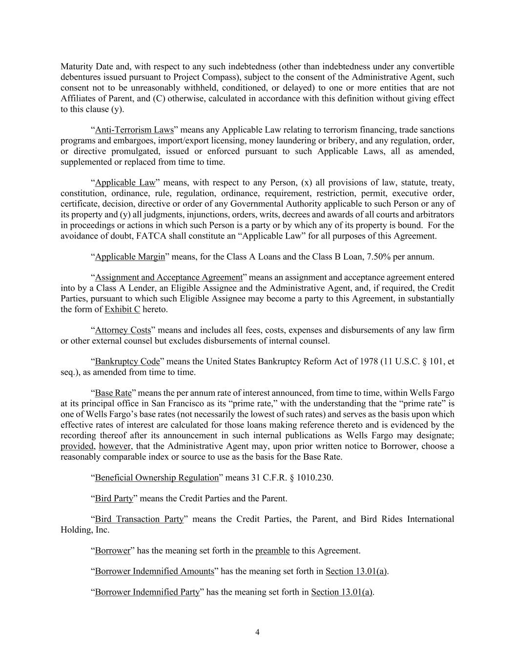4 Maturity Date and, with respect to any such indebtedness (other than indebtedness under any convertible debentures issued pursuant to Project Compass), subject to the consent of the Administrative Agent, such consent not to be unreasonably withheld, conditioned, or delayed) to one or more entities that are not Affiliates of Parent, and (C) otherwise, calculated in accordance with this definition without giving effect to this clause (y). “Anti-Terrorism Laws” means any Applicable Law relating to terrorism financing, trade sanctions programs and embargoes, import/export licensing, money laundering or bribery, and any regulation, order, or directive promulgated, issued or enforced pursuant to such Applicable Laws, all as amended, supplemented or replaced from time to time. “Applicable Law” means, with respect to any Person, (x) all provisions of law, statute, treaty, constitution, ordinance, rule, regulation, ordinance, requirement, restriction, permit, executive order, certificate, decision, directive or order of any Governmental Authority applicable to such Person or any of its property and (y) all judgments, injunctions, orders, writs, decrees and awards of all courts and arbitrators in proceedings or actions in which such Person is a party or by which any of its property is bound. For the avoidance of doubt, FATCA shall constitute an “Applicable Law” for all purposes of this Agreement. “Applicable Margin” means, for the Class A Loans and the Class B Loan, 7.50% per annum. “Assignment and Acceptance Agreement” means an assignment and acceptance agreement entered into by a Class A Lender, an Eligible Assignee and the Administrative Agent, and, if required, the Credit Parties, pursuant to which such Eligible Assignee may become a party to this Agreement, in substantially the form of Exhibit C hereto. “Attorney Costs” means and includes all fees, costs, expenses and disbursements of any law firm or other external counsel but excludes disbursements of internal counsel. “Bankruptcy Code” means the United States Bankruptcy Reform Act of 1978 (11 U.S.C. § 101, et seq.), as amended from time to time. “Base Rate” means the per annum rate of interest announced, from time to time, within Wells Fargo at its principal office in San Francisco as its “prime rate,” with the understanding that the “prime rate” is one of Wells Fargo’s base rates (not necessarily the lowest of such rates) and serves as the basis upon which effective rates of interest are calculated for those loans making reference thereto and is evidenced by the recording thereof after its announcement in such internal publications as Wells Fargo may designate; provided, however, that the Administrative Agent may, upon prior written notice to Borrower, choose a reasonably comparable index or source to use as the basis for the Base Rate. “Beneficial Ownership Regulation” means 31 C.F.R. § 1010.230. “Bird Party” means the Credit Parties and the Parent. “Bird Transaction Party” means the Credit Parties, the Parent, and Bird Rides International Holding, Inc. “Borrower” has the meaning set forth in the preamble to this Agreement. “Borrower Indemnified Amounts” has the meaning set forth in Section 13.01(a). “Borrower Indemnified Party” has the meaning set forth in Section 13.01(a).