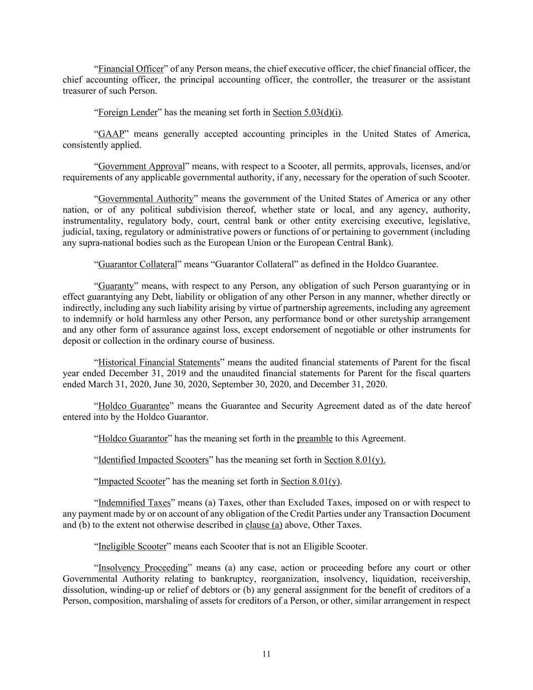 11 “Financial Officer” of any Person means, the chief executive officer, the chief financial officer, the chief accounting officer, the principal accounting officer, the controller, the treasurer or the assistant treasurer of such Person. “Foreign Lender” has the meaning set forth in Section 5.03(d)(i). “GAAP” means generally accepted accounting principles in the United States of America, consistently applied. “Government Approval” means, with respect to a Scooter, all permits, approvals, licenses, and/or requirements of any applicable governmental authority, if any, necessary for the operation of such Scooter. “Governmental Authority” means the government of the United States of America or any other nation, or of any political subdivision thereof, whether state or local, and any agency, authority, instrumentality, regulatory body, court, central bank or other entity exercising executive, legislative, judicial, taxing, regulatory or administrative powers or functions of or pertaining to government (including any supra-national bodies such as the European Union or the European Central Bank). “Guarantor Collateral” means “Guarantor Collateral” as defined in the Holdco Guarantee. “Guaranty” means, with respect to any Person, any obligation of such Person guarantying or in effect guarantying any Debt, liability or obligation of any other Person in any manner, whether directly or indirectly, including any such liability arising by virtue of partnership agreements, including any agreement to indemnify or hold harmless any other Person, any performance bond or other suretyship arrangement and any other form of assurance against loss, except endorsement of negotiable or other instruments for deposit or collection in the ordinary course of business. “Historical Financial Statements” means the audited financial statements of Parent for the fiscal year ended December 31, 2019 and the unaudited financial statements for Parent for the fiscal quarters ended March 31, 2020, June 30, 2020, September 30, 2020, and December 31, 2020. “Holdco Guarantee” means the Guarantee and Security Agreement dated as of the date hereof entered into by the Holdco Guarantor. “Holdco Guarantor” has the meaning set forth in the preamble to this Agreement. “Identified Impacted Scooters” has the meaning set forth in Section 8.01(y). “Impacted Scooter” has the meaning set forth in Section 8.01(y). “Indemnified Taxes” means (a) Taxes, other than Excluded Taxes, imposed on or with respect to any payment made by or on account of any obligation of the Credit Parties under any Transaction Document and (b) to the extent not otherwise described in clause (a) above, Other Taxes. “Ineligible Scooter” means each Scooter that is not an Eligible Scooter. “Insolvency Proceeding” means (a) any case, action or proceeding before any court or other Governmental Authority relating to bankruptcy, reorganization, insolvency, liquidation, receivership, dissolution, winding-up or relief of debtors or (b) any general assignment for the benefit of creditors of a Person, composition, marshaling of assets for creditors of a Person, or other, similar arrangement in respect
