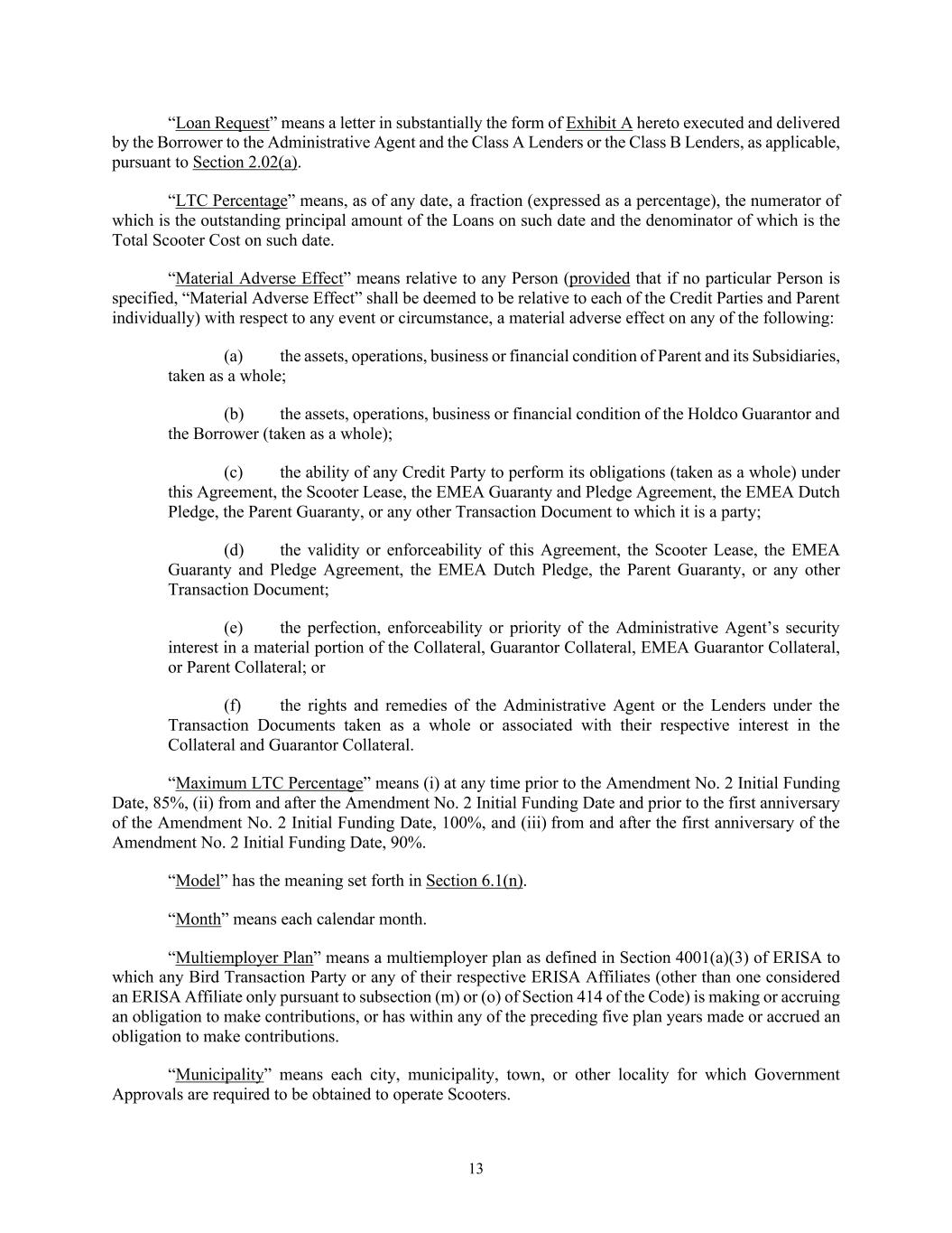 13 “Loan Request” means a letter in substantially the form of Exhibit A hereto executed and delivered by the Borrower to the Administrative Agent and the Class A Lenders or the Class B Lenders, as applicable, pursuant to Section 2.02(a). “LTC Percentage” means, as of any date, a fraction (expressed as a percentage), the numerator of which is the outstanding principal amount of the Loans on such date and the denominator of which is the Total Scooter Cost on such date. “Material Adverse Effect” means relative to any Person (provided that if no particular Person is specified, “Material Adverse Effect” shall be deemed to be relative to each of the Credit Parties and Parent individually) with respect to any event or circumstance, a material adverse effect on any of the following: (a) the assets, operations, business or financial condition of Parent and its Subsidiaries, taken as a whole; (b) the assets, operations, business or financial condition of the Holdco Guarantor and the Borrower (taken as a whole); (c) the ability of any Credit Party to perform its obligations (taken as a whole) under this Agreement, the Scooter Lease, the EMEA Guaranty and Pledge Agreement, the EMEA Dutch Pledge, the Parent Guaranty, or any other Transaction Document to which it is a party; (d) the validity or enforceability of this Agreement, the Scooter Lease, the EMEA Guaranty and Pledge Agreement, the EMEA Dutch Pledge, the Parent Guaranty, or any other Transaction Document; (e) the perfection, enforceability or priority of the Administrative Agent’s security interest in a material portion of the Collateral, Guarantor Collateral, EMEA Guarantor Collateral, or Parent Collateral; or (f) the rights and remedies of the Administrative Agent or the Lenders under the Transaction Documents taken as a whole or associated with their respective interest in the Collateral and Guarantor Collateral. “Maximum LTC Percentage” means (i) at any time prior to the Amendment No. 2 Initial Funding Date, 85%, (ii) from and after the Amendment No. 2 Initial Funding Date and prior to the first anniversary of the Amendment No. 2 Initial Funding Date, 100%, and (iii) from and after the first anniversary of the Amendment No. 2 Initial Funding Date, 90%. “Model” has the meaning set forth in Section 6.1(n). “Month” means each calendar month. “Multiemployer Plan” means a multiemployer plan as defined in Section 4001(a)(3) of ERISA to which any Bird Transaction Party or any of their respective ERISA Affiliates (other than one considered an ERISA Affiliate only pursuant to subsection (m) or (o) of Section 414 of the Code) is making or accruing an obligation to make contributions, or has within any of the preceding five plan years made or accrued an obligation to make contributions. “Municipality” means each city, municipality, town, or other locality for which Government Approvals are required to be obtained to operate Scooters.