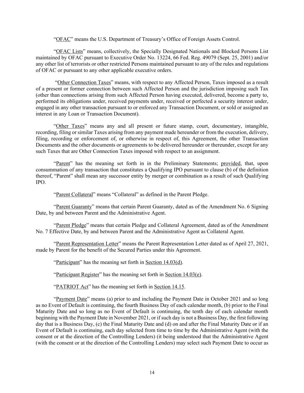 14 “OFAC” means the U.S. Department of Treasury’s Office of Foreign Assets Control. “OFAC Lists” means, collectively, the Specially Designated Nationals and Blocked Persons List maintained by OFAC pursuant to Executive Order No. 13224, 66 Fed. Reg. 49079 (Sept. 25, 2001) and/or any other list of terrorists or other restricted Persons maintained pursuant to any of the rules and regulations of OFAC or pursuant to any other applicable executive orders. “Other Connection Taxes” means, with respect to any Affected Person, Taxes imposed as a result of a present or former connection between such Affected Person and the jurisdiction imposing such Tax (other than connections arising from such Affected Person having executed, delivered, become a party to, performed its obligations under, received payments under, received or perfected a security interest under, engaged in any other transaction pursuant to or enforced any Transaction Document, or sold or assigned an interest in any Loan or Transaction Document). “Other Taxes” means any and all present or future stamp, court, documentary, intangible, recording, filing or similar Taxes arising from any payment made hereunder or from the execution, delivery, filing, recording or enforcement of, or otherwise in respect of, this Agreement, the other Transaction Documents and the other documents or agreements to be delivered hereunder or thereunder, except for any such Taxes that are Other Connection Taxes imposed with respect to an assignment. “Parent” has the meaning set forth in in the Preliminary Statements; provided, that, upon consummation of any transaction that constitutes a Qualifying IPO pursuant to clause (b) of the definition thereof, “Parent” shall mean any successor entity by merger or combination as a result of such Qualifying IPO. “Parent Collateral” means “Collateral” as defined in the Parent Pledge. “Parent Guaranty” means that certain Parent Guaranty, dated as of the Amendment No. 6 Signing Date, by and between Parent and the Administrative Agent. “Parent Pledge” means that certain Pledge and Collateral Agreement, dated as of the Amendment No. 7 Effective Date, by and between Parent and the Administrative Agent as Collateral Agent. “Parent Representation Letter” means the Parent Representation Letter dated as of April 27, 2021, made by Parent for the benefit of the Secured Parties under this Agreement. “Participant” has the meaning set forth in Section 14.03(d). “Participant Register” has the meaning set forth in Section 14.03(e). “PATRIOT Act” has the meaning set forth in Section 14.15. “Payment Date” means (a) prior to and including the Payment Date in October 2021 and so long as no Event of Default is continuing, the fourth Business Day of each calendar month, (b) prior to the Final Maturity Date and so long as no Event of Default is continuing, the tenth day of each calendar month beginning with the Payment Date in November 2021, or if such day is not a Business Day, the first following day that is a Business Day, (c) the Final Maturity Date and (d) on and after the Final Maturity Date or if an Event of Default is continuing, each day selected from time to time by the Administrative Agent (with the consent or at the direction of the Controlling Lenders) (it being understood that the Administrative Agent (with the consent or at the direction of the Controlling Lenders) may select such Payment Date to occur as
