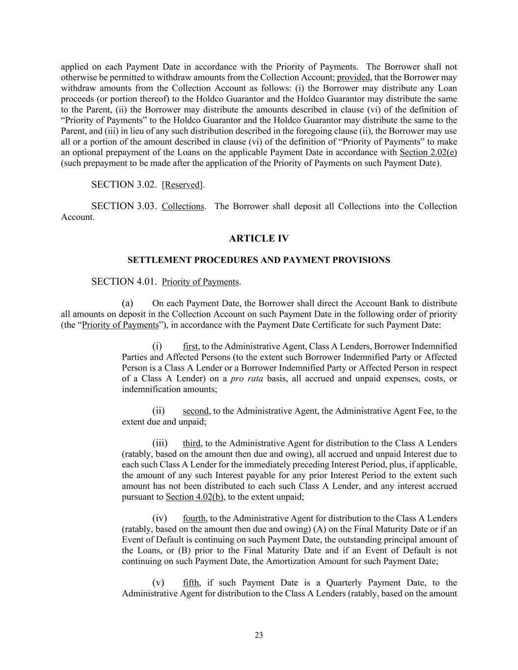 23 applied on each Payment Date in accordance with the Priority of Payments. The Borrower shall not otherwise be permitted to withdraw amounts from the Collection Account; provided, that the Borrower may withdraw amounts from the Collection Account as follows: (i) the Borrower may distribute any Loan proceeds (or portion thereof) to the Holdco Guarantor and the Holdco Guarantor may distribute the same to the Parent, (ii) the Borrower may distribute the amounts described in clause (vi) of the definition of “Priority of Payments” to the Holdco Guarantor and the Holdco Guarantor may distribute the same to the Parent, and (iii) in lieu of any such distribution described in the foregoing clause (ii), the Borrower may use all or a portion of the amount described in clause (vi) of the definition of “Priority of Payments” to make an optional prepayment of the Loans on the applicable Payment Date in accordance with Section 2.02(e) (such prepayment to be made after the application of the Priority of Payments on such Payment Date). SECTION 3.02. [Reserved]. SECTION 3.03. Collections. The Borrower shall deposit all Collections into the Collection Account. ARTICLE IV SETTLEMENT PROCEDURES AND PAYMENT PROVISIONS SECTION 4.01. Priority of Payments. (a) On each Payment Date, the Borrower shall direct the Account Bank to distribute all amounts on deposit in the Collection Account on such Payment Date in the following order of priority (the “Priority of Payments”), in accordance with the Payment Date Certificate for such Payment Date: (i) first, to the Administrative Agent, Class A Lenders, Borrower Indemnified Parties and Affected Persons (to the extent such Borrower Indemnified Party or Affected Person is a Class A Lender or a Borrower Indemnified Party or Affected Person in respect of a Class A Lender) on a pro rata basis, all accrued and unpaid expenses, costs, or indemnification amounts; (ii) second, to the Administrative Agent, the Administrative Agent Fee, to the extent due and unpaid; (iii) third, to the Administrative Agent for distribution to the Class A Lenders (ratably, based on the amount then due and owing), all accrued and unpaid Interest due to each such Class A Lender for the immediately preceding Interest Period, plus, if applicable, the amount of any such Interest payable for any prior Interest Period to the extent such amount has not been distributed to each such Class A Lender, and any interest accrued pursuant to Section 4.02(b), to the extent unpaid; (iv) fourth, to the Administrative Agent for distribution to the Class A Lenders (ratably, based on the amount then due and owing) (A) on the Final Maturity Date or if an Event of Default is continuing on such Payment Date, the outstanding principal amount of the Loans, or (B) prior to the Final Maturity Date and if an Event of Default is not continuing on such Payment Date, the Amortization Amount for such Payment Date; (v) fifth, if such Payment Date is a Quarterly Payment Date, to the Administrative Agent for distribution to the Class A Lenders (ratably, based on the amount