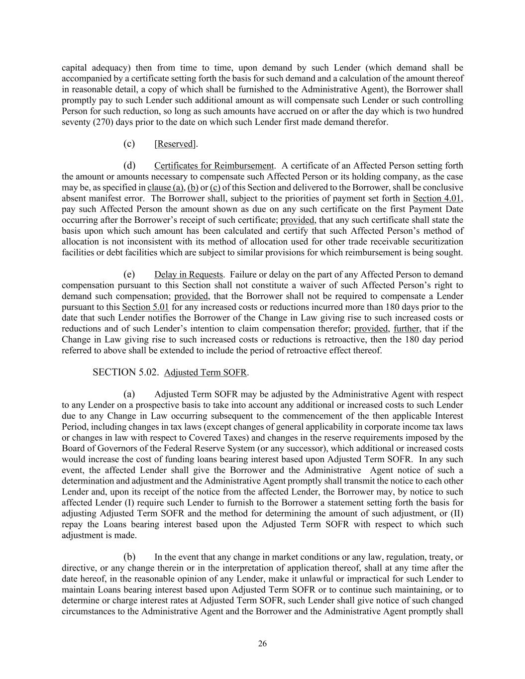 26 capital adequacy) then from time to time, upon demand by such Lender (which demand shall be accompanied by a certificate setting forth the basis for such demand and a calculation of the amount thereof in reasonable detail, a copy of which shall be furnished to the Administrative Agent), the Borrower shall promptly pay to such Lender such additional amount as will compensate such Lender or such controlling Person for such reduction, so long as such amounts have accrued on or after the day which is two hundred seventy (270) days prior to the date on which such Lender first made demand therefor. (c) [Reserved]. (d) Certificates for Reimbursement. A certificate of an Affected Person setting forth the amount or amounts necessary to compensate such Affected Person or its holding company, as the case may be, as specified in clause (a), (b) or (c) of this Section and delivered to the Borrower, shall be conclusive absent manifest error. The Borrower shall, subject to the priorities of payment set forth in Section 4.01, pay such Affected Person the amount shown as due on any such certificate on the first Payment Date occurring after the Borrower’s receipt of such certificate; provided, that any such certificate shall state the basis upon which such amount has been calculated and certify that such Affected Person’s method of allocation is not inconsistent with its method of allocation used for other trade receivable securitization facilities or debt facilities which are subject to similar provisions for which reimbursement is being sought. (e) Delay in Requests. Failure or delay on the part of any Affected Person to demand compensation pursuant to this Section shall not constitute a waiver of such Affected Person’s right to demand such compensation; provided, that the Borrower shall not be required to compensate a Lender pursuant to this Section 5.01 for any increased costs or reductions incurred more than 180 days prior to the date that such Lender notifies the Borrower of the Change in Law giving rise to such increased costs or reductions and of such Lender’s intention to claim compensation therefor; provided, further, that if the Change in Law giving rise to such increased costs or reductions is retroactive, then the 180 day period referred to above shall be extended to include the period of retroactive effect thereof. SECTION 5.02. Adjusted Term SOFR. (a) Adjusted Term SOFR may be adjusted by the Administrative Agent with respect to any Lender on a prospective basis to take into account any additional or increased costs to such Lender due to any Change in Law occurring subsequent to the commencement of the then applicable Interest Period, including changes in tax laws (except changes of general applicability in corporate income tax laws or changes in law with respect to Covered Taxes) and changes in the reserve requirements imposed by the Board of Governors of the Federal Reserve System (or any successor), which additional or increased costs would increase the cost of funding loans bearing interest based upon Adjusted Term SOFR. In any such event, the affected Lender shall give the Borrower and the Administrative Agent notice of such a determination and adjustment and the Administrative Agent promptly shall transmit the notice to each other Lender and, upon its receipt of the notice from the affected Lender, the Borrower may, by notice to such affected Lender (I) require such Lender to furnish to the Borrower a statement setting forth the basis for adjusting Adjusted Term SOFR and the method for determining the amount of such adjustment, or (II) repay the Loans bearing interest based upon the Adjusted Term SOFR with respect to which such adjustment is made. (b) In the event that any change in market conditions or any law, regulation, treaty, or directive, or any change therein or in the interpretation of application thereof, shall at any time after the date hereof, in the reasonable opinion of any Lender, make it unlawful or impractical for such Lender to maintain Loans bearing interest based upon Adjusted Term SOFR or to continue such maintaining, or to determine or charge interest rates at Adjusted Term SOFR, such Lender shall give notice of such changed circumstances to the Administrative Agent and the Borrower and the Administrative Agent promptly shall