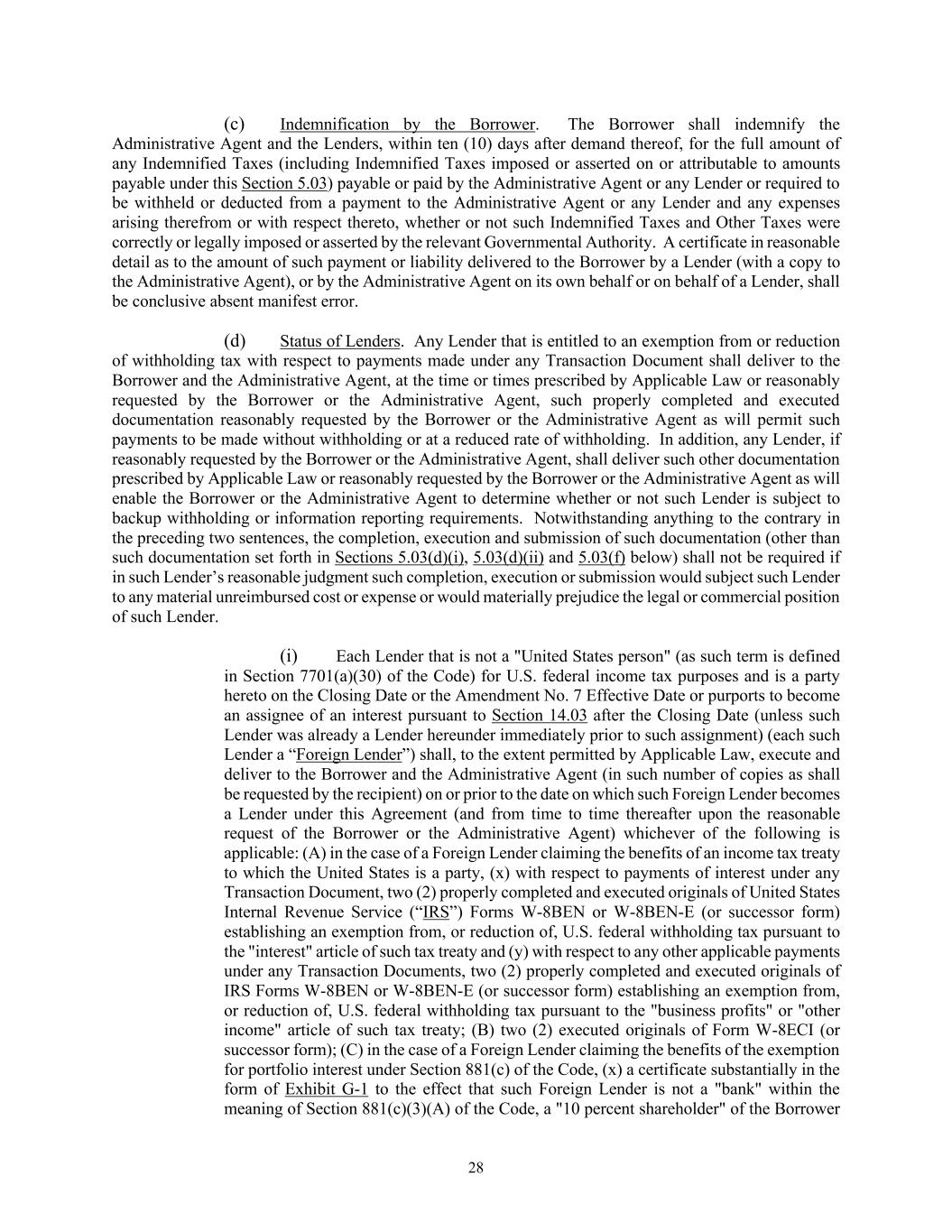 28 (c) Indemnification by the Borrower. The Borrower shall indemnify the Administrative Agent and the Lenders, within ten (10) days after demand thereof, for the full amount of any Indemnified Taxes (including Indemnified Taxes imposed or asserted on or attributable to amounts payable under this Section 5.03) payable or paid by the Administrative Agent or any Lender or required to be withheld or deducted from a payment to the Administrative Agent or any Lender and any expenses arising therefrom or with respect thereto, whether or not such Indemnified Taxes and Other Taxes were correctly or legally imposed or asserted by the relevant Governmental Authority. A certificate in reasonable detail as to the amount of such payment or liability delivered to the Borrower by a Lender (with a copy to the Administrative Agent), or by the Administrative Agent on its own behalf or on behalf of a Lender, shall be conclusive absent manifest error. (d) Status of Lenders. Any Lender that is entitled to an exemption from or reduction of withholding tax with respect to payments made under any Transaction Document shall deliver to the Borrower and the Administrative Agent, at the time or times prescribed by Applicable Law or reasonably requested by the Borrower or the Administrative Agent, such properly completed and executed documentation reasonably requested by the Borrower or the Administrative Agent as will permit such payments to be made without withholding or at a reduced rate of withholding. In addition, any Lender, if reasonably requested by the Borrower or the Administrative Agent, shall deliver such other documentation prescribed by Applicable Law or reasonably requested by the Borrower or the Administrative Agent as will enable the Borrower or the Administrative Agent to determine whether or not such Lender is subject to backup withholding or information reporting requirements. Notwithstanding anything to the contrary in the preceding two sentences, the completion, execution and submission of such documentation (other than such documentation set forth in Sections 5.03(d)(i), 5.03(d)(ii) and 5.03(f) below) shall not be required if in such Lender’s reasonable judgment such completion, execution or submission would subject such Lender to any material unreimbursed cost or expense or would materially prejudice the legal or commercial position of such Lender. (i) Each Lender that is not a "United States person" (as such term is defined in Section 7701(a)(30) of the Code) for U.S. federal income tax purposes and is a party hereto on the Closing Date or the Amendment No. 7 Effective Date or purports to become an assignee of an interest pursuant to Section 14.03 after the Closing Date (unless such Lender was already a Lender hereunder immediately prior to such assignment) (each such Lender a “Foreign Lender”) shall, to the extent permitted by Applicable Law, execute and deliver to the Borrower and the Administrative Agent (in such number of copies as shall be requested by the recipient) on or prior to the date on which such Foreign Lender becomes a Lender under this Agreement (and from time to time thereafter upon the reasonable request of the Borrower or the Administrative Agent) whichever of the following is applicable: (A) in the case of a Foreign Lender claiming the benefits of an income tax treaty to which the United States is a party, (x) with respect to payments of interest under any Transaction Document, two (2) properly completed and executed originals of United States Internal Revenue Service (“IRS”) Forms W-8BEN or W-8BEN-E (or successor form) establishing an exemption from, or reduction of, U.S. federal withholding tax pursuant to the "interest" article of such tax treaty and (y) with respect to any other applicable payments under any Transaction Documents, two (2) properly completed and executed originals of IRS Forms W-8BEN or W-8BEN-E (or successor form) establishing an exemption from, or reduction of, U.S. federal withholding tax pursuant to the "business profits" or "other income" article of such tax treaty; (B) two (2) executed originals of Form W-8ECI (or successor form); (C) in the case of a Foreign Lender claiming the benefits of the exemption for portfolio interest under Section 881(c) of the Code, (x) a certificate substantially in the form of Exhibit G-1 to the effect that such Foreign Lender is not a "bank" within the meaning of Section 881(c)(3)(A) of the Code, a "10 percent shareholder" of the Borrower