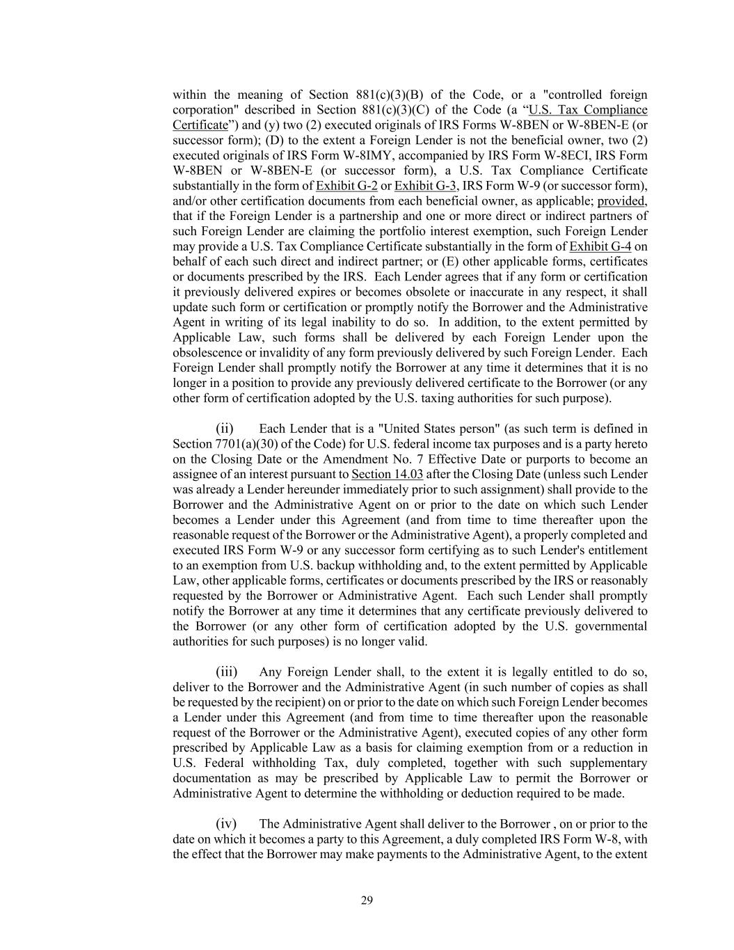 29 within the meaning of Section 881(c)(3)(B) of the Code, or a "controlled foreign corporation" described in Section 881(c)(3)(C) of the Code (a “U.S. Tax Compliance Certificate”) and (y) two (2) executed originals of IRS Forms W-8BEN or W-8BEN-E (or successor form); (D) to the extent a Foreign Lender is not the beneficial owner, two (2) executed originals of IRS Form W-8IMY, accompanied by IRS Form W-8ECI, IRS Form W-8BEN or W-8BEN-E (or successor form), a U.S. Tax Compliance Certificate substantially in the form of Exhibit G-2 or Exhibit G-3, IRS Form W-9 (or successor form), and/or other certification documents from each beneficial owner, as applicable; provided, that if the Foreign Lender is a partnership and one or more direct or indirect partners of such Foreign Lender are claiming the portfolio interest exemption, such Foreign Lender may provide a U.S. Tax Compliance Certificate substantially in the form of Exhibit G-4 on behalf of each such direct and indirect partner; or (E) other applicable forms, certificates or documents prescribed by the IRS. Each Lender agrees that if any form or certification it previously delivered expires or becomes obsolete or inaccurate in any respect, it shall update such form or certification or promptly notify the Borrower and the Administrative Agent in writing of its legal inability to do so. In addition, to the extent permitted by Applicable Law, such forms shall be delivered by each Foreign Lender upon the obsolescence or invalidity of any form previously delivered by such Foreign Lender. Each Foreign Lender shall promptly notify the Borrower at any time it determines that it is no longer in a position to provide any previously delivered certificate to the Borrower (or any other form of certification adopted by the U.S. taxing authorities for such purpose). (ii) Each Lender that is a "United States person" (as such term is defined in Section 7701(a)(30) of the Code) for U.S. federal income tax purposes and is a party hereto on the Closing Date or the Amendment No. 7 Effective Date or purports to become an assignee of an interest pursuant to Section 14.03 after the Closing Date (unless such Lender was already a Lender hereunder immediately prior to such assignment) shall provide to the Borrower and the Administrative Agent on or prior to the date on which such Lender becomes a Lender under this Agreement (and from time to time thereafter upon the reasonable request of the Borrower or the Administrative Agent), a properly completed and executed IRS Form W-9 or any successor form certifying as to such Lender's entitlement to an exemption from U.S. backup withholding and, to the extent permitted by Applicable Law, other applicable forms, certificates or documents prescribed by the IRS or reasonably requested by the Borrower or Administrative Agent. Each such Lender shall promptly notify the Borrower at any time it determines that any certificate previously delivered to the Borrower (or any other form of certification adopted by the U.S. governmental authorities for such purposes) is no longer valid. (iii) Any Foreign Lender shall, to the extent it is legally entitled to do so, deliver to the Borrower and the Administrative Agent (in such number of copies as shall be requested by the recipient) on or prior to the date on which such Foreign Lender becomes a Lender under this Agreement (and from time to time thereafter upon the reasonable request of the Borrower or the Administrative Agent), executed copies of any other form prescribed by Applicable Law as a basis for claiming exemption from or a reduction in U.S. Federal withholding Tax, duly completed, together with such supplementary documentation as may be prescribed by Applicable Law to permit the Borrower or Administrative Agent to determine the withholding or deduction required to be made. (iv) The Administrative Agent shall deliver to the Borrower , on or prior to the date on which it becomes a party to this Agreement, a duly completed IRS Form W-8, with the effect that the Borrower may make payments to the Administrative Agent, to the extent