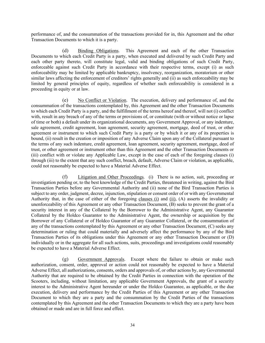 34 performance of, and the consummation of the transactions provided for in, this Agreement and the other Transaction Documents to which it is a party. (d) Binding Obligations. This Agreement and each of the other Transaction Documents to which each Credit Party is a party, when executed and delivered by such Credit Party and each other party thereto, will constitute legal, valid and binding obligations of such Credit Party, enforceable against such Credit Party in accordance with their respective terms, except (i) as such enforceability may be limited by applicable bankruptcy, insolvency, reorganization, moratorium or other similar laws affecting the enforcement of creditors’ rights generally and (ii) as such enforceability may be limited by general principles of equity, regardless of whether such enforceability is considered in a proceeding in equity or at law. (e) No Conflict or Violation. The execution, delivery and performance of, and the consummation of the transactions contemplated by, this Agreement and the other Transaction Documents to which each Credit Party is a party, and the fulfillment of the terms hereof and thereof, will not (i) conflict with, result in any breach of any of the terms or provisions of, or constitute (with or without notice or lapse of time or both) a default under its organizational documents, any Government Approval, or any indenture, sale agreement, credit agreement, loan agreement, security agreement, mortgage, deed of trust, or other agreement or instrument to which such Credit Party is a party or by which it or any of its properties is bound, (ii) result in the creation or imposition of any Adverse Claim upon any of the Collateral pursuant to the terms of any such indenture, credit agreement, loan agreement, security agreement, mortgage, deed of trust, or other agreement or instrument other than this Agreement and the other Transaction Documents or (iii) conflict with or violate any Applicable Law, except in the case of each of the foregoing clauses (i) through (iii) to the extent that any such conflict, breach, default, Adverse Claim or violation, as applicable, could not reasonably be expected to have a Material Adverse Effect. (f) Litigation and Other Proceedings. (i) There is no action, suit, proceeding or investigation pending or, to the best knowledge of the Credit Parties, threatened in writing, against the Bird Transaction Parties before any Governmental Authority and (ii) none of the Bird Transaction Parties is subject to any order, judgment, decree, injunction, stipulation or consent order of or with any Governmental Authority that, in the case of either of the foregoing clauses (i) and (ii), (A) asserts the invalidity or unenforceability of this Agreement or any other Transaction Document, (B) seeks to prevent the grant of a security interest in any of the Collateral by the Borrower to the Administrative Agent, any Guarantor Collateral by the Holdco Guarantor to the Administrative Agent, the ownership or acquisition by the Borrower of any Collateral or of Holdco Guarantor of any Guarantor Collateral, or the consummation of any of the transactions contemplated by this Agreement or any other Transaction Document, (C) seeks any determination or ruling that could materially and adversely affect the performance by any of the Bird Transaction Parties of its obligations under this Agreement or any other Transaction Document or (D) individually or in the aggregate for all such actions, suits, proceedings and investigations could reasonably be expected to have a Material Adverse Effect. (g) Government Approvals. Except where the failure to obtain or make such authorization, consent, order, approval or action could not reasonably be expected to have a Material Adverse Effect, all authorizations, consents, orders and approvals of, or other actions by, any Governmental Authority that are required to be obtained by the Credit Parties in connection with the operation of the Scooters, including, without limitation, any applicable Government Approvals, the grant of a security interest to the Administrative Agent hereunder or under the Holdco Guarantee, as applicable, or the due execution, delivery and performance by the Credit Parties of this Agreement or any other Transaction Document to which they are a party and the consummation by the Credit Parties of the transactions contemplated by this Agreement and the other Transaction Documents to which they are a party have been obtained or made and are in full force and effect.