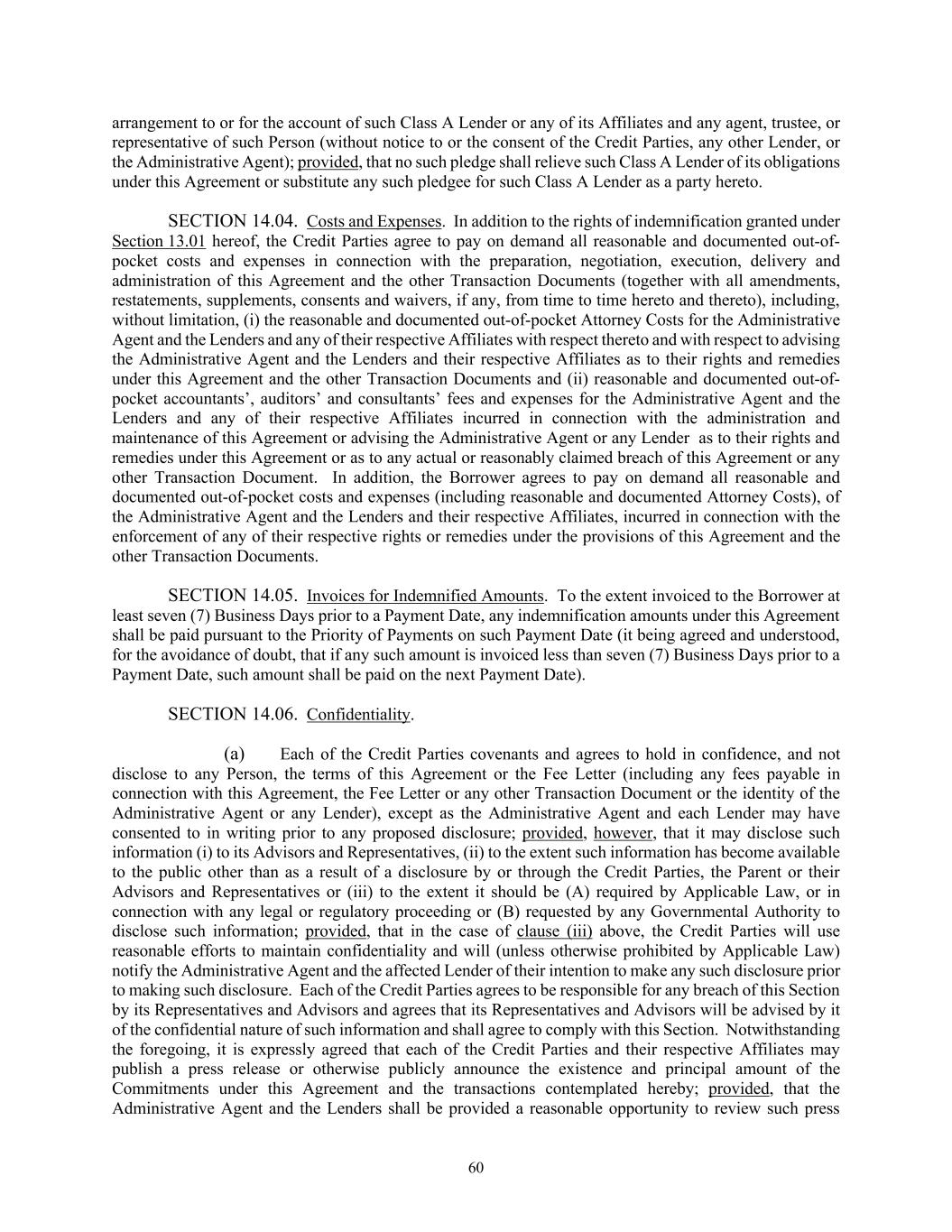 60 arrangement to or for the account of such Class A Lender or any of its Affiliates and any agent, trustee, or representative of such Person (without notice to or the consent of the Credit Parties, any other Lender, or the Administrative Agent); provided, that no such pledge shall relieve such Class A Lender of its obligations under this Agreement or substitute any such pledgee for such Class A Lender as a party hereto. SECTION 14.04. Costs and Expenses. In addition to the rights of indemnification granted under Section 13.01 hereof, the Credit Parties agree to pay on demand all reasonable and documented out-of- pocket costs and expenses in connection with the preparation, negotiation, execution, delivery and administration of this Agreement and the other Transaction Documents (together with all amendments, restatements, supplements, consents and waivers, if any, from time to time hereto and thereto), including, without limitation, (i) the reasonable and documented out-of-pocket Attorney Costs for the Administrative Agent and the Lenders and any of their respective Affiliates with respect thereto and with respect to advising the Administrative Agent and the Lenders and their respective Affiliates as to their rights and remedies under this Agreement and the other Transaction Documents and (ii) reasonable and documented out-of- pocket accountants’, auditors’ and consultants’ fees and expenses for the Administrative Agent and the Lenders and any of their respective Affiliates incurred in connection with the administration and maintenance of this Agreement or advising the Administrative Agent or any Lender as to their rights and remedies under this Agreement or as to any actual or reasonably claimed breach of this Agreement or any other Transaction Document. In addition, the Borrower agrees to pay on demand all reasonable and documented out-of-pocket costs and expenses (including reasonable and documented Attorney Costs), of the Administrative Agent and the Lenders and their respective Affiliates, incurred in connection with the enforcement of any of their respective rights or remedies under the provisions of this Agreement and the other Transaction Documents. SECTION 14.05. Invoices for Indemnified Amounts. To the extent invoiced to the Borrower at least seven (7) Business Days prior to a Payment Date, any indemnification amounts under this Agreement shall be paid pursuant to the Priority of Payments on such Payment Date (it being agreed and understood, for the avoidance of doubt, that if any such amount is invoiced less than seven (7) Business Days prior to a Payment Date, such amount shall be paid on the next Payment Date). SECTION 14.06. Confidentiality. (a) Each of the Credit Parties covenants and agrees to hold in confidence, and not disclose to any Person, the terms of this Agreement or the Fee Letter (including any fees payable in connection with this Agreement, the Fee Letter or any other Transaction Document or the identity of the Administrative Agent or any Lender), except as the Administrative Agent and each Lender may have consented to in writing prior to any proposed disclosure; provided, however, that it may disclose such information (i) to its Advisors and Representatives, (ii) to the extent such information has become available to the public other than as a result of a disclosure by or through the Credit Parties, the Parent or their Advisors and Representatives or (iii) to the extent it should be (A) required by Applicable Law, or in connection with any legal or regulatory proceeding or (B) requested by any Governmental Authority to disclose such information; provided, that in the case of clause (iii) above, the Credit Parties will use reasonable efforts to maintain confidentiality and will (unless otherwise prohibited by Applicable Law) notify the Administrative Agent and the affected Lender of their intention to make any such disclosure prior to making such disclosure. Each of the Credit Parties agrees to be responsible for any breach of this Section by its Representatives and Advisors and agrees that its Representatives and Advisors will be advised by it of the confidential nature of such information and shall agree to comply with this Section. Notwithstanding the foregoing, it is expressly agreed that each of the Credit Parties and their respective Affiliates may publish a press release or otherwise publicly announce the existence and principal amount of the Commitments under this Agreement and the transactions contemplated hereby; provided, that the Administrative Agent and the Lenders shall be provided a reasonable opportunity to review such press