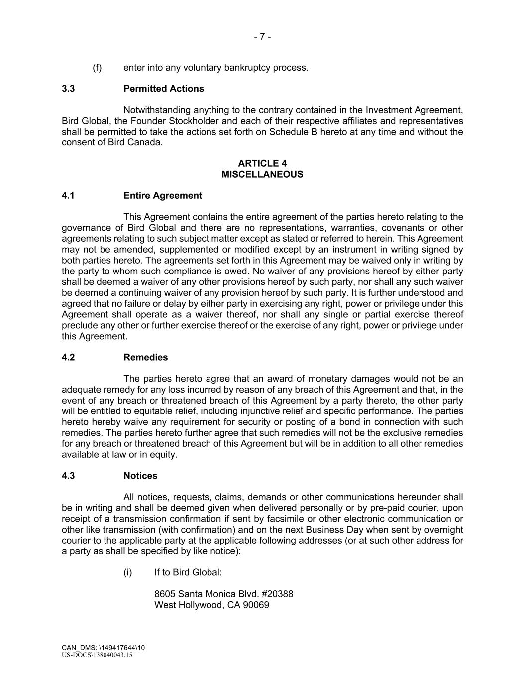 - 7 - US-DOCS\138040043.15 CAN_DMS: \149417644\10 (f) enter into any voluntary bankruptcy process. 3.3 Permitted Actions Notwithstanding anything to the contrary contained in the Investment Agreement, Bird Global, the Founder Stockholder and each of their respective affiliates and representatives shall be permitted to take the actions set forth on Schedule B hereto at any time and without the consent of Bird Canada. ARTICLE 4 MISCELLANEOUS 4.1 Entire Agreement This Agreement contains the entire agreement of the parties hereto relating to the governance of Bird Global and there are no representations, warranties, covenants or other agreements relating to such subject matter except as stated or referred to herein. This Agreement may not be amended, supplemented or modified except by an instrument in writing signed by both parties hereto. The agreements set forth in this Agreement may be waived only in writing by the party to whom such compliance is owed. No waiver of any provisions hereof by either party shall be deemed a waiver of any other provisions hereof by such party, nor shall any such waiver be deemed a continuing waiver of any provision hereof by such party. It is further understood and agreed that no failure or delay by either party in exercising any right, power or privilege under this Agreement shall operate as a waiver thereof, nor shall any single or partial exercise thereof preclude any other or further exercise thereof or the exercise of any right, power or privilege under this Agreement. 4.2 Remedies The parties hereto agree that an award of monetary damages would not be an adequate remedy for any loss incurred by reason of any breach of this Agreement and that, in the event of any breach or threatened breach of this Agreement by a party thereto, the other party will be entitled to equitable relief, including injunctive relief and specific performance. The parties hereto hereby waive any requirement for security or posting of a bond in connection with such remedies. The parties hereto further agree that such remedies will not be the exclusive remedies for any breach or threatened breach of this Agreement but will be in addition to all other remedies available at law or in equity. 4.3 Notices All notices, requests, claims, demands or other communications hereunder shall be in writing and shall be deemed given when delivered personally or by pre-paid courier, upon receipt of a transmission confirmation if sent by facsimile or other electronic communication or other like transmission (with confirmation) and on the next Business Day when sent by overnight courier to the applicable party at the applicable following addresses (or at such other address for a party as shall be specified by like notice): (i) If to Bird Global: 8605 Santa Monica Blvd. #20388 West Hollywood, CA 90069